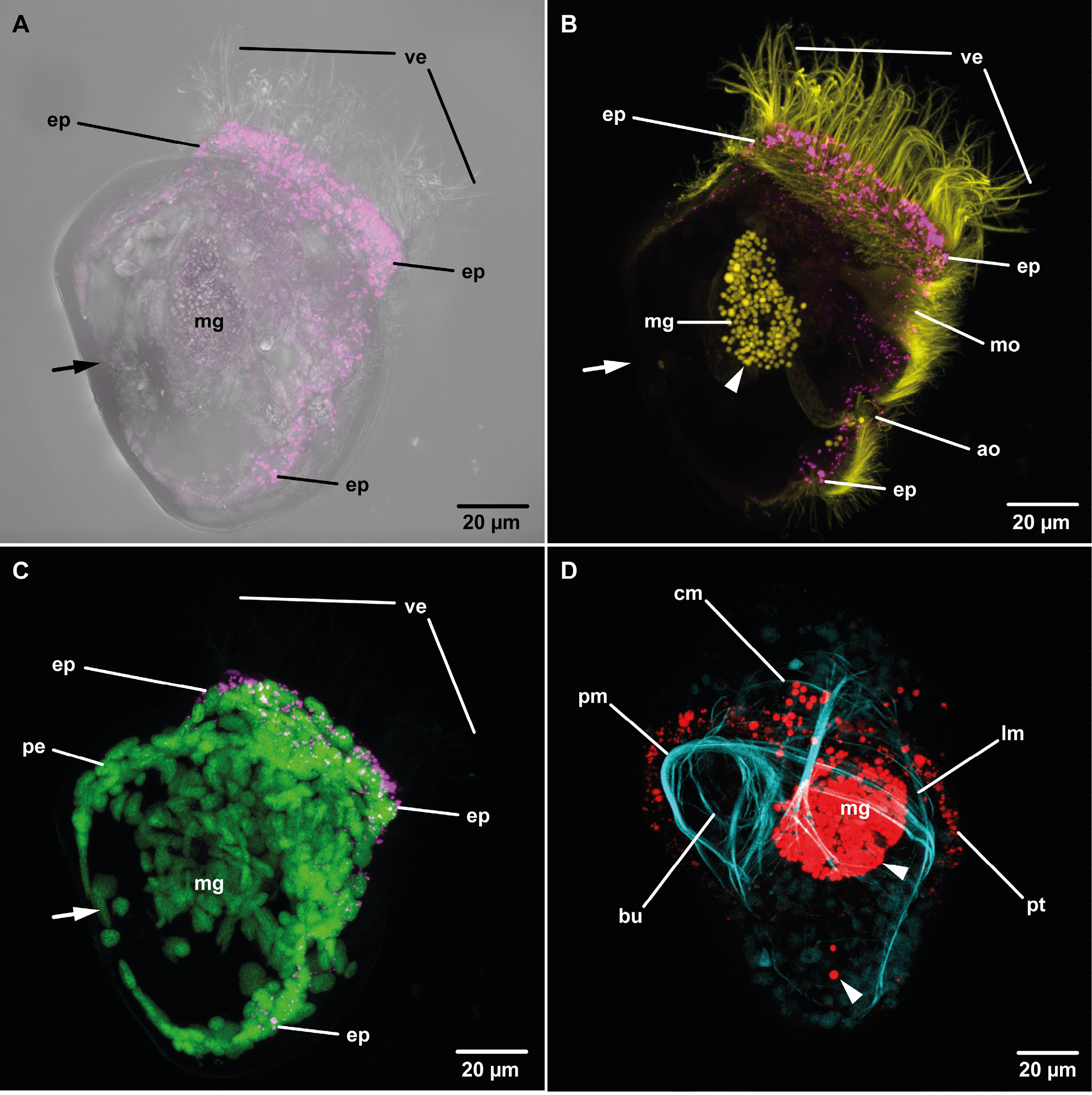 Figure 3. Advanced larvae some days after staining with DiI/Pluronic (A-C, anterior to top right corner) or DiD/Pluronic (D), cLSM (magenta: DiI, yellow: anti α-tubulin, green: nuclei, red: DiD, cyan: phalloidin). A. Mytilus edulis, 6-day old larva: The most prominent DiI signals are seen in epidermis (ep) of the velum (ve) and along the ventral side, no signal is detectable on the dorsal side (arrow). The midgut (mg) is filled with unicellular planktonic algae. B. Same as in (A): DiI signal is prominent in the ciliated epidermis (ep) of the velum (ve) and along the ventral side encompassing the mouth (mo) and the anal opening (ao). No DiI signal is seen in the unciliated epidermis (arrow). The midgut (mg) is filled with algae that show intense chlorophyll autofluorescence (arrowhead). C. Same as in (A): The primary epidermis cells (ep) of the velum (ve) and on the ventral side show DiI signal. No DiI signal is detected in the midgut (mg) and the dorsal pallial epithelium (pe, arrow). D. Thalassema thalassema, 4-day old larva (anterior is up): The ciliated prototroch (pt) shows prominent DiD signal. Labeling of F-actin with phalloidin shows the prominent ring-muscle underneath the prototroch (pm), the buccal muscles (bu) and some additional circular (cm) and longitudinal muscle (lm) strands. Ingested unicellular planktonic algae in the midgut (mg) show an intense chlorophyll autofluorescence (arrowheads).