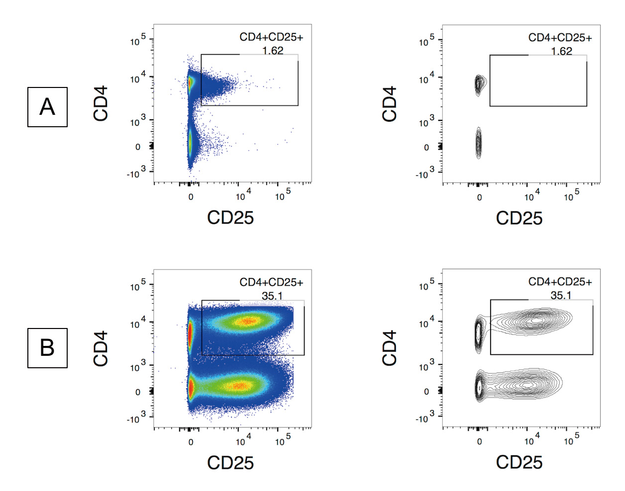 Figure 1. Examples of pseudocolor plots and contour plots for gate establishment. Samples were previously gated on single cells/lymphocytes/live/CD3+. A. Sample in pseudocolor and contour plots. B. 96 h stimulated sample in dot and contour plot.