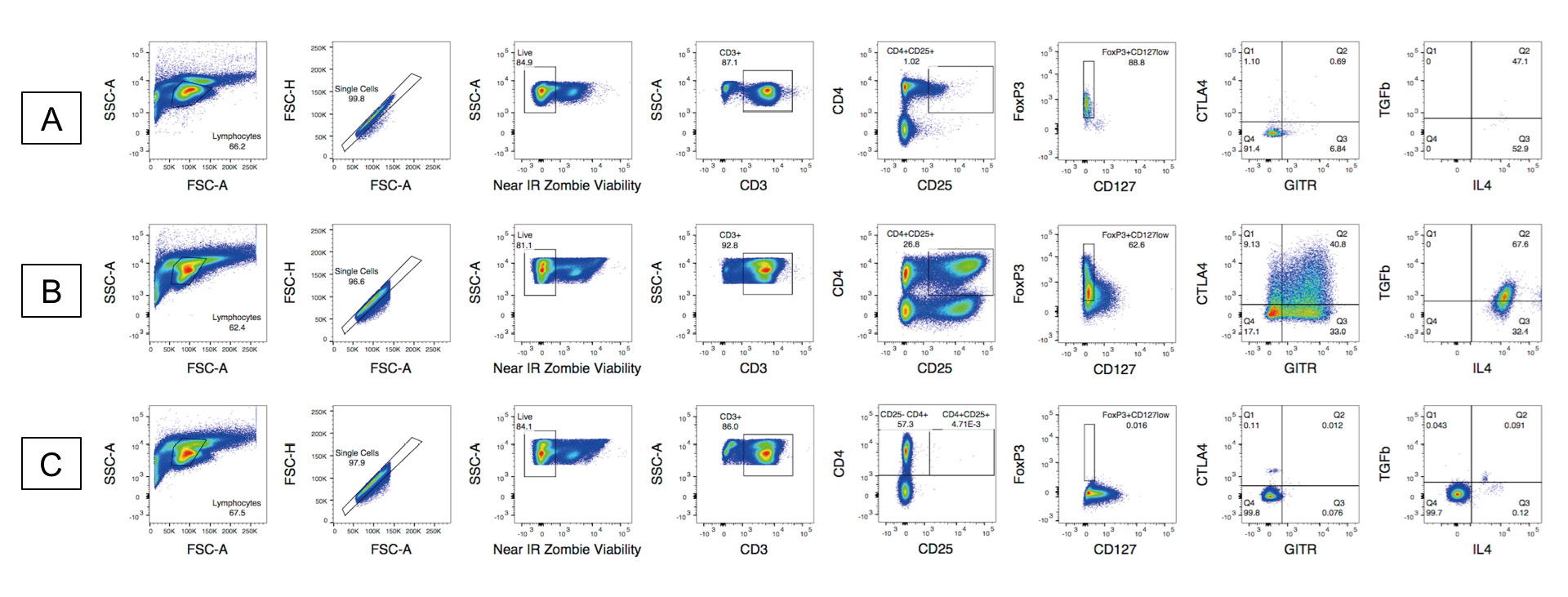 Figure 2. Pseudo color plots for donor A exhibiting increase in expression in unstimulated sample (A) and 96 h stimulated sample (B) with the FMO for reference (C). Gates are conserved for individual donor samples. A. Full staining and gating strategy for Treg specific markers on unstimulated donor A sample. There is low expression of CD3+CD4+CD25+, as well as low FoxP3 and CD127neg/low expression. B. Full staining and gating strategy for Treg specific markers on 96 h stimulated donor A sample. C. The FMO gating strategy for donor (A). CD4+CD25- is the parent population for all subsequent FMO gates. The FMO, unstimulated sample, and 96 h stimulated sample gating strategy for each donor can be found in the supplemental section (Fig. S1).