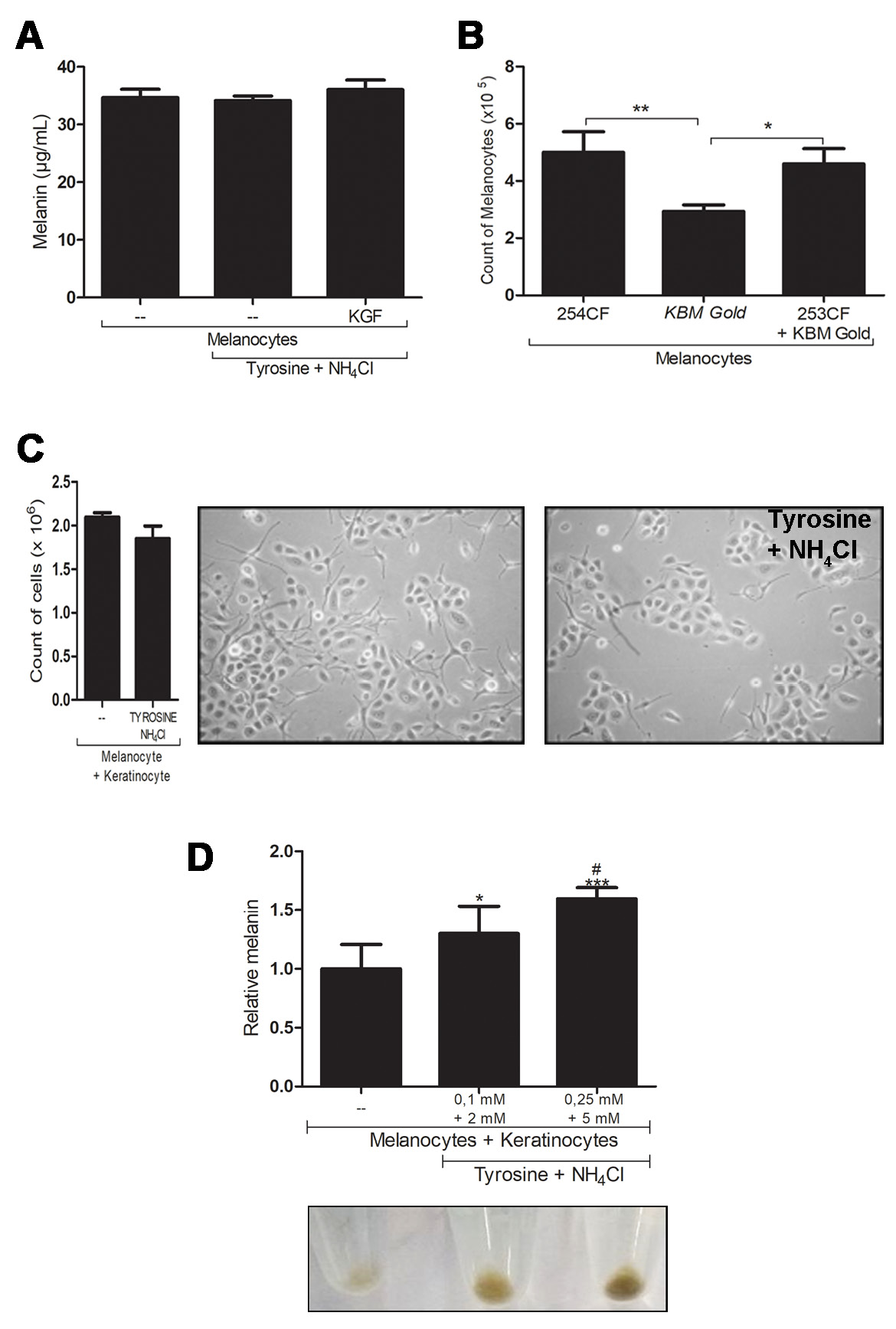 Figure 1. The melanogenesis model using melanocytes plus keratinocytes. A. Melanin content (μg/ml) in melanocytes treated or not with tyrosine (0.25 mM) + NH4Cl (5 mM) in the presence and absence of KGF (20 ng/ml) in 254CF medium for 5 d (n = 6). B. Melanocytes count after 5 d in 254CF, KGM Gold, or 1:1 254CF:KGM Gold medium (n = 3). C. Melanocytes + keratinocytes count and microscopy (40x) in co-culture stimulated with tyrosine (0.25 mM) + NH4Cl (5 mM) for 5 d (n = 6). D. Melanin content in melanocytes plus keratinocytes cocultures (2.5 × 105 cells each) in presence of tyrosine (0.1 and 0.25 mM) and NH4Cl (2 and 5 mM) after 5 d and pellets aspect for each condition (n = 6). *P < 0.05, **P < 0.01, and ***P < 0.001 compared with the control. #P < 0.05 compared with the condition of lowest concentration.