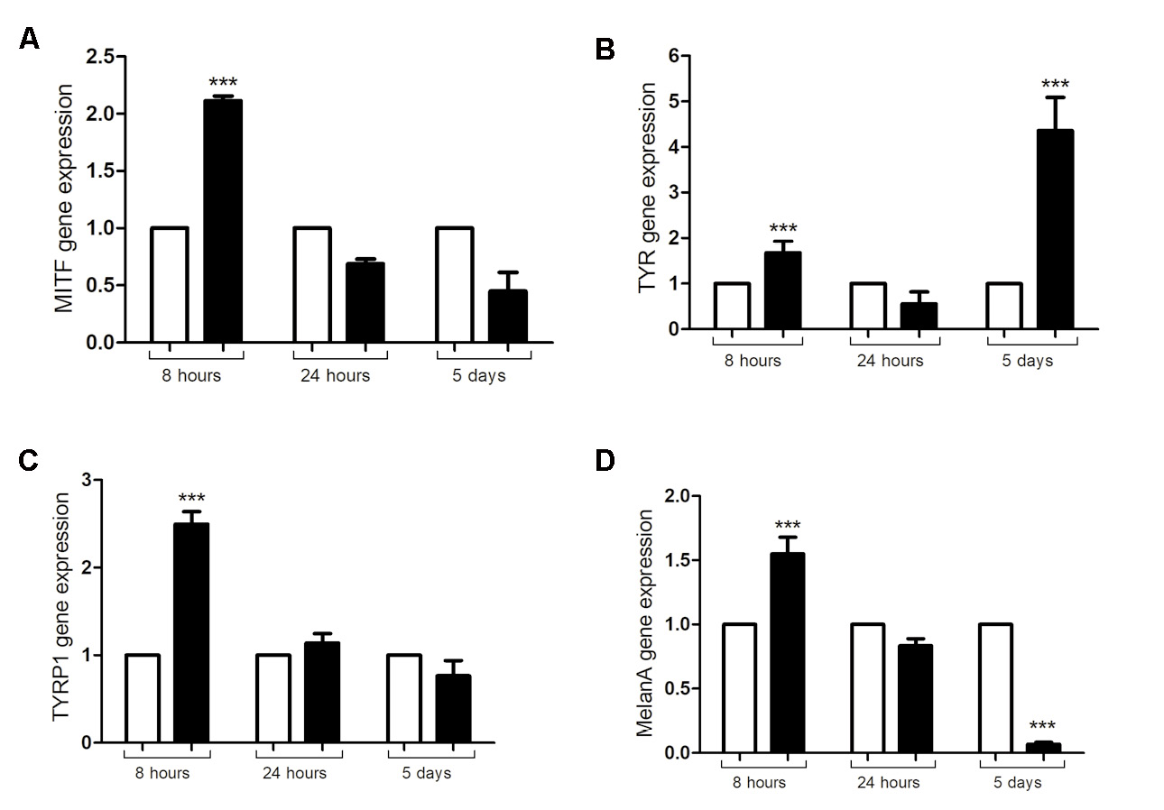 Figure 2. Gene expression of melanogenesis markers. Gene expression of MITF (A), TYR (B), TYRP1 (C), and Melan-A (D) in melanocytes plus keratinocytes co-cultures (2.5 × 105 cells each) stimulated with tyrosine (0.25 mM) and NH4Cl (5 mM) for 8 h, 24 h, and 5 d (n = 6). GAPDH was used as the reaction calibrator. Comparative method (2-ΔΔCT) was used to analyze the levels of mRNA expression. The white bars refer to the control, and the black bars refer to conditions stimulated with tyrosine plus NH4Cl. ***P < 0.001.