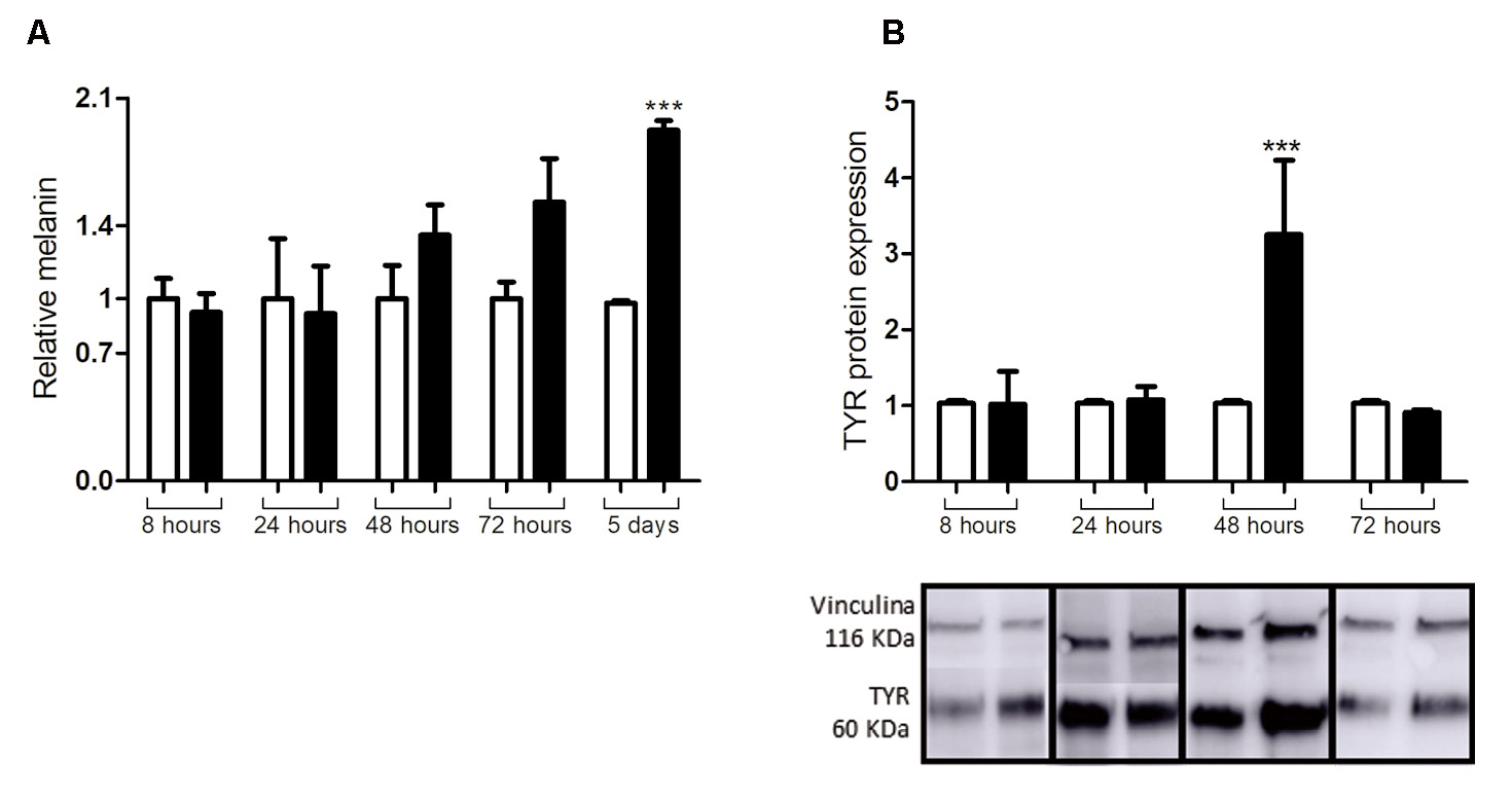 Figure 3. Protein expression of TYR and melanin content over time in melanocytes plus keratinocytes co-culture (2.5 × 105 cells each) stimulated with tyrosine (0.25 mM) and NH4Cl (5 mM) for 8, 24, 48 and 72 h. A. Relative melanin content from 8 h to 5 d (n = 6). B. Relative intensity of TYR bands and representative western blot. The endogenous antibody used was anti-vinculin (n = 4). The white bars refer to the control, and the black bars refer to the conditions stimulated with tyrosine plus NH4Cl. ***P < 0.001.
