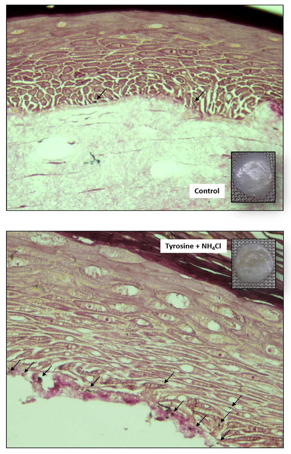 In order to verify the stimulus of tyrosine + NH4Cl in a more complex model, we used a lab 3D skin model. During the skin stratification phase, that is 12 d at the air-liquid interface, 0.25 mM tyrosine and 5 mM NH4Cl were added in the fresh culture medium every 2 d. Pigmentation was visually observable, and the melanosomes were identified by histological sections stained with Fontana-Masson (Fig. 4).