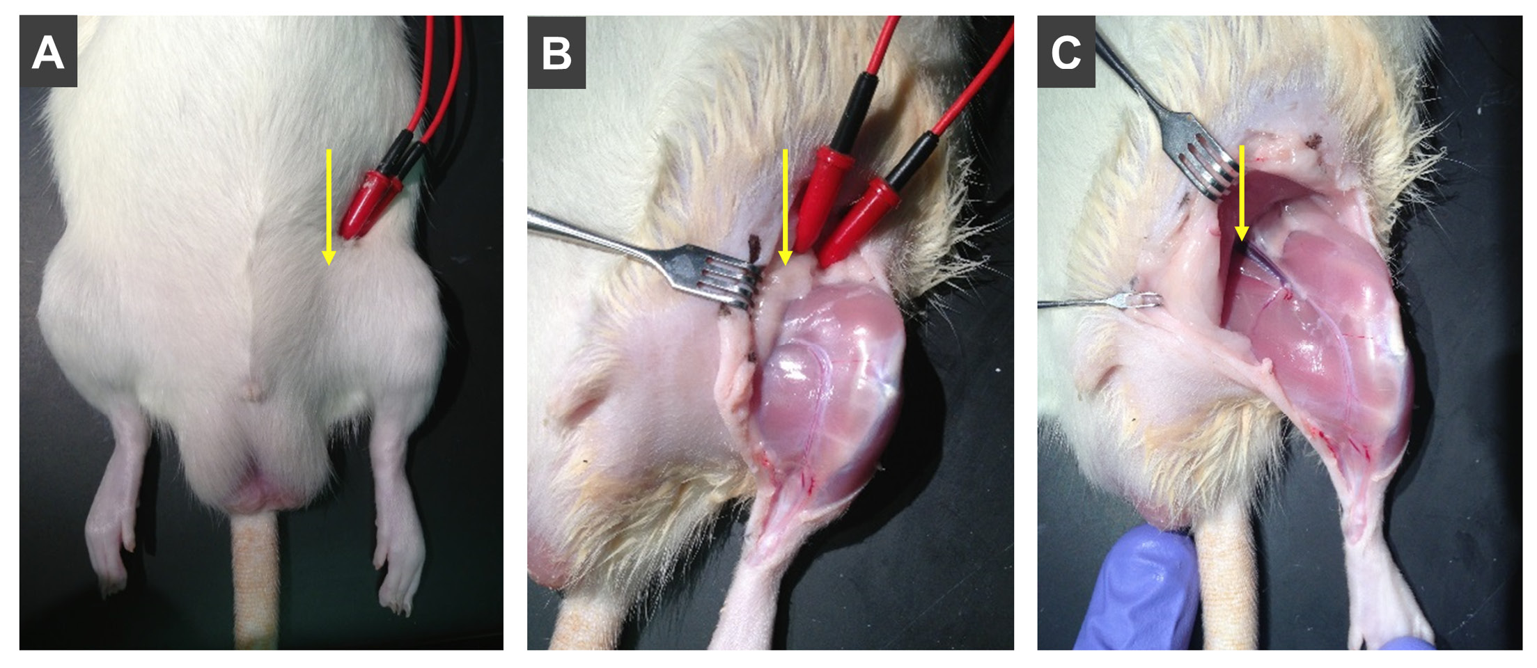 Figure 2. Location of stimulation. The femoral nerve is used to stimulate the quadriceps muscles. A. Placement of electrodes: The femoral nerve passes over the anterior aspect of the hip (yellow arrow) before innervating the quadriceps. B. Subcutaneous view: The femoral nerve is subcutaneous, but covered in a layer of peritoneal fat. C. Depth of neurovascular bundle: Despite being in a “superficial” location (relative to the musculoskeletal anatomy), due to the fat the subcutaneous needle electrodes must be pushed ~1 cm into the groin for optimal stimulation.