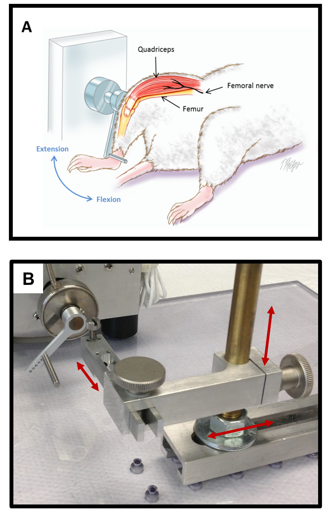 Figure 3. In vivo apparatus. A. Drawing illustrates the general setup used to assess quadriceps strength, the thigh is stabilized and the leg attached to a motor-driven lever arm. The quadriceps muscle is stimulated via the femoral nerve while the lever arm records torque. To produce a contraction-induced injury, the quadriceps muscle is stimulated via the femoral nerve to produce extension while the lever arm forces the knee into flexion (arrow). Image modified from Pratt et al., J Physiology, 2013, used with permission. B. The apparatus is shown without the animal. The custom-made device we use to lock the needle into a fixed position is adjustable in all three anatomical planes (red arrows). Any device would work, as long as the needle is immobilized and, assuming it is placed through the axis of the knee, in line with the axis of the stepper motor.