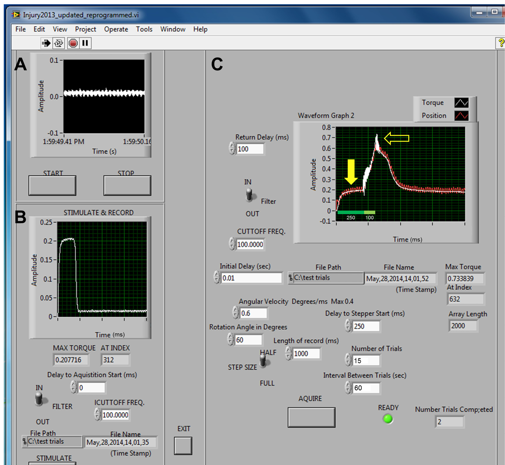 6.We use commercial software (LabView version 2013, National Instruments, Austin, TX) to synchronize contractile activation, onset of knee rotation, and torque data collection (Fig. 4). For lengthening contractions, stimulation of the quadriceps muscles occurs while the computer-controlled motor simultaneously moves the lever arm against the direction of knee extension, thus leading to a lengthening contraction (also called “eccentric” contraction which, if maximal and repeated, causes injury of the muscle). The specific protocol depends on the desired magnitude of injury and is designed by the investigator. The magnitude of injury, or tissue damage, can be regulated by manipulation of variables such as angular velocity, timing of muscle activation, range of motion, and the number of lengthening contractions.