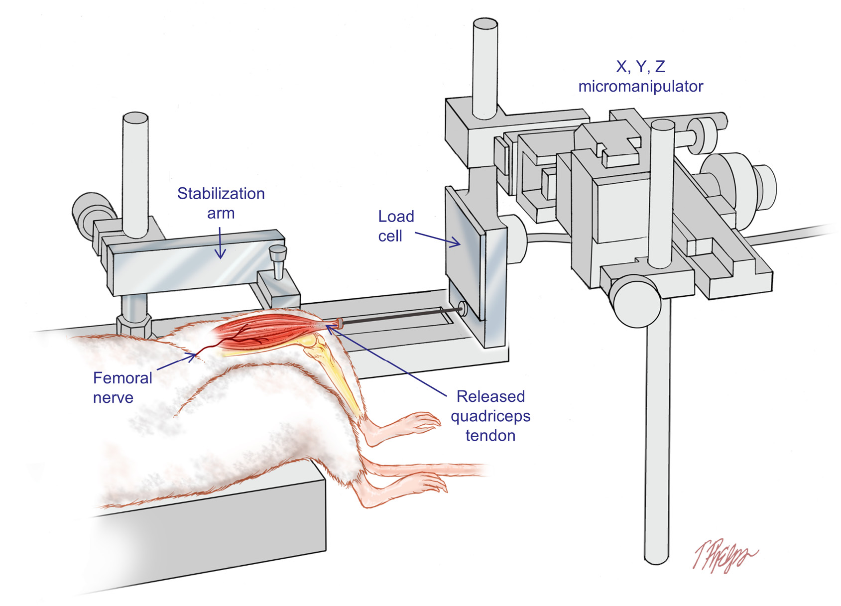 The in situ apparatus we describe is used to determine the “specific force” (force per unit of cross sectional area) of an individual muscle. This setup is more typical of classic muscle physiology whereby the muscle is isolated and positioned properly; this also avoids force transmission from nearby muscles [17], although this is less of a concern in this protocol as there are no additional knee extensors. The in situ apparatus provides an alternative for measuring contractility of only one muscle with a known length and mass. Although the in situ apparatus provides more experimental control when measuring the force of an individual muscle, the trade-off is that the experiment becomes less physiologic. It requires a surgical release of the quadriceps muscle, which can alter the architecture (muscle fiber orientation) and affect force transmission. The experiment is also terminal, so the muscle cannot be monitored over time.