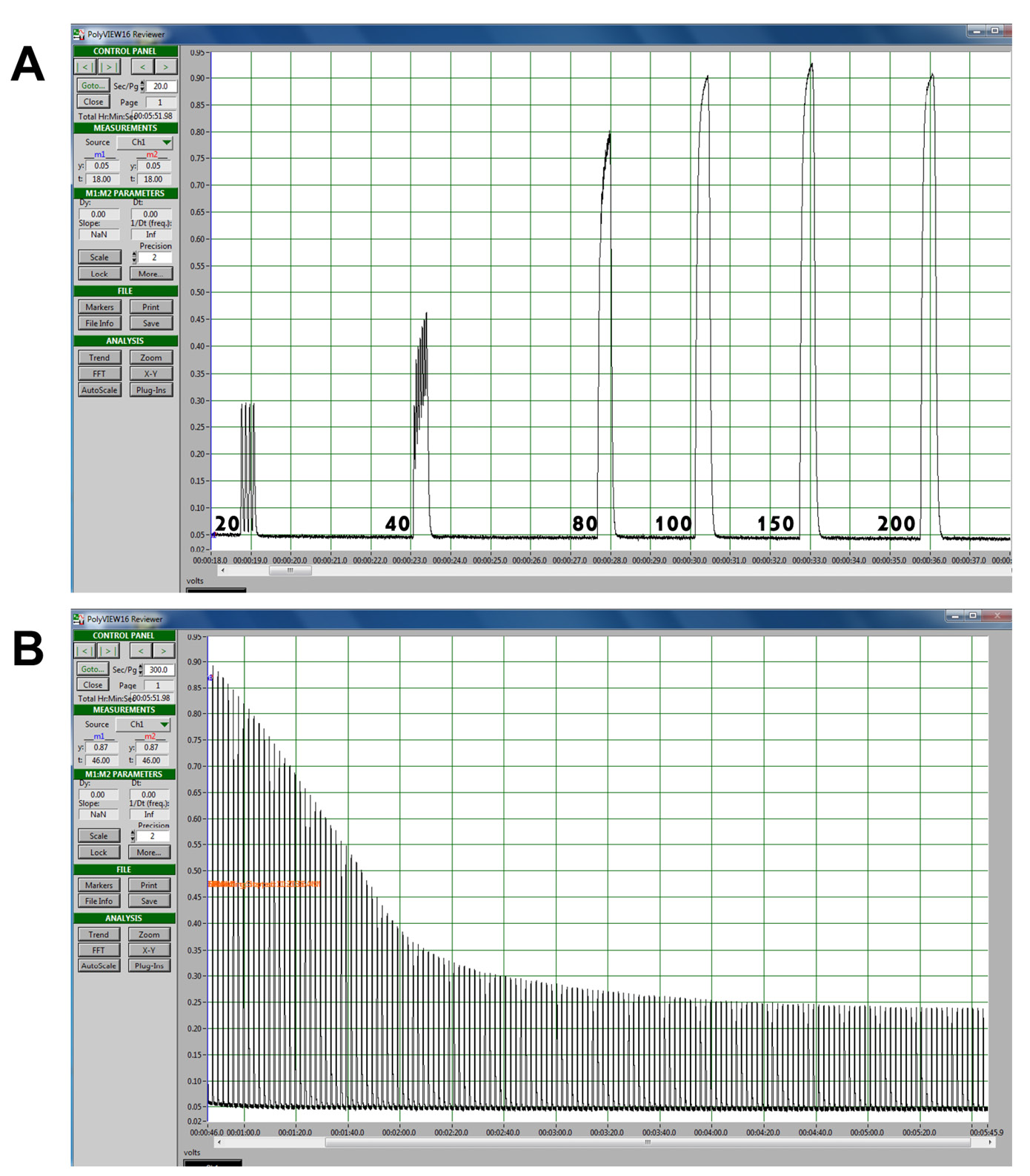 Figure 6. Sample tension data from in situ apparatus. A. A screen shot display of typical data showing how a force-frequency curve is generated. Curves shown were produced from maximal contractions (200 ms duration) at incrementing higher frequencies in the quadriceps muscle in a rat. Note that maximal force is generated at ~ 150 Hz and diminishes with higher frequency. This optimal frequency can vary depending on the muscle group tested and the conditions (e.g., direct nerve stimulation as here versus field stimulation when muscles are removed for in vitro experiments, not shown here). B. One can also measure the decline in maximal isometric tetanic tension during repeated stimulation to assess fatigue. In this example, the quadriceps was isolated, adjusted to optimal length (Lo), and then stimulated with a 200 ms tetanic contraction once every second for 5 minutes.