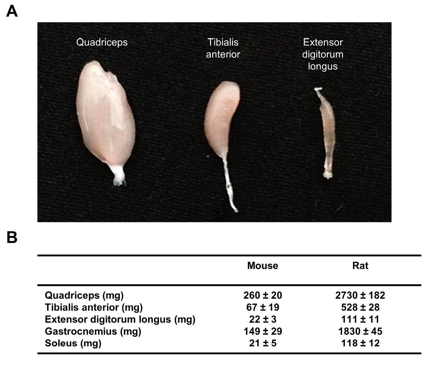 Figure 7. Comparison of quadriceps to other commonly tested hindlimb muscles. A. The quadriceps and the dorsiflexor muscles (tibialis anterior and extensor digitorum longus) from a mouse hindlimb are shown for size comparison. B. The table shows weights of commonly assessed muscles from the rodent hindlimb for comparison of muscle mass (from animals 2-3 months old, N = 3 each species).