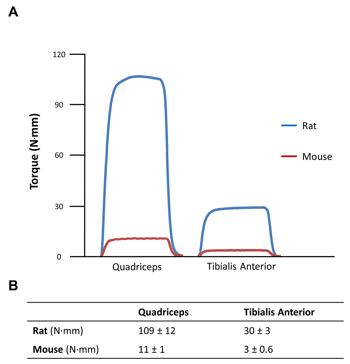 Figure 8. Comparison of mouse/rat quadriceps and tibialis anterior muscles. A. Representative in vivo trace recordings from a rat (blue) and mouse (red) are shown for the quadriceps and tibialis anterior muscles. In this example, muscles were stimulated for 200 ms at optimal muscle length to induce a maximal isometric contraction (torque). Contractile forces are much higher in the quadriceps compared to the ankle dorsiflexors (i.e., tibialis anterior), which have, in our experience, made it easier to discern differences in function. B. For reference, the table shows torque data derived from 12 Sprague-Dawley rats and 12 C57BL/10 mice; as noted in the text, the absolute values shown can be normalized to muscle weight. For experiments (or comparing different studies), care should be taken to evaluate animals that are age-matched, gender-matched, and of the same strain and species. Ideally, muscle measurements are obtained on the same rig.
