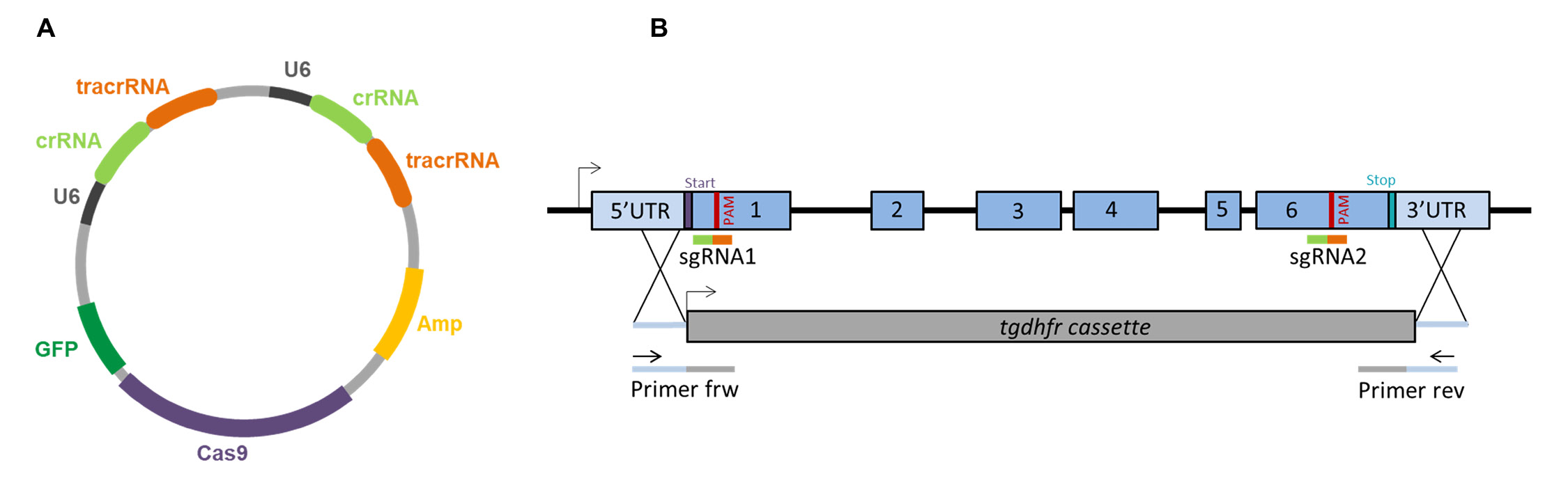 gondii due to its simplicity and the well-known mode of action. The CRISPR RNA (crRNA) whose 5’ end is complementary to the target DNA, partially hybridizes with the trans-activating CRISPR RNA (tracrRNA) to form an RNA complex, termed single guide RNA (sgRNA). Whereas the 20 nt part of the crRNA confers DNA target specificity, the tracrRNA plays a crucial role in Cas9 recruitment and binding [