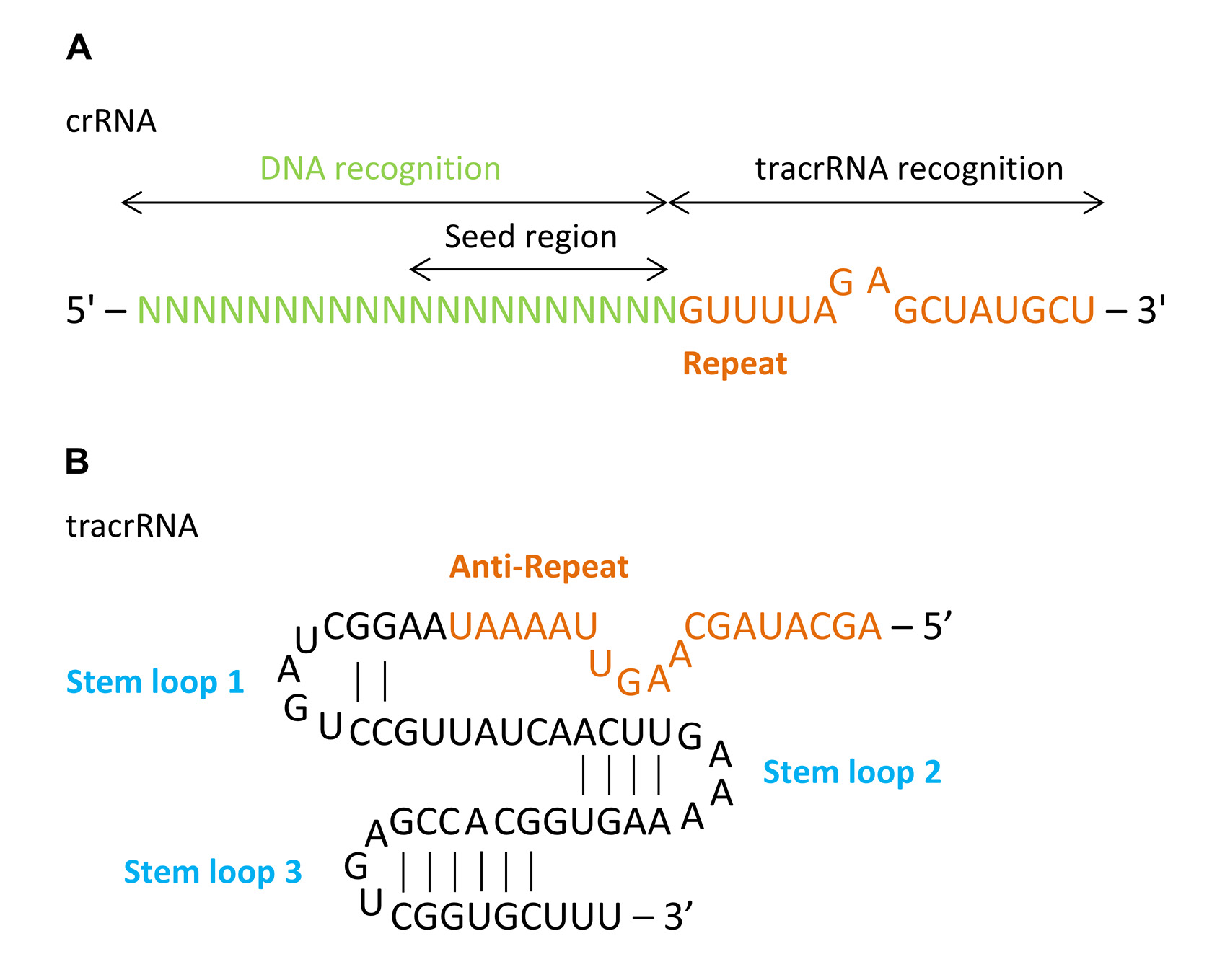 Figure 2. Sequence recognition and structure of synthetic crRNA and tracrRNA. A. The target recognition part of the crRNA consists of 20 nt, whereas the seed region is the 10 nt initiating the DNA binding nucleation. B. The tracrRNA consists of 67 nt comprising an anti-repeat region complementary to the crRNA-repeat and stem loops responsible for Cas9 binding.