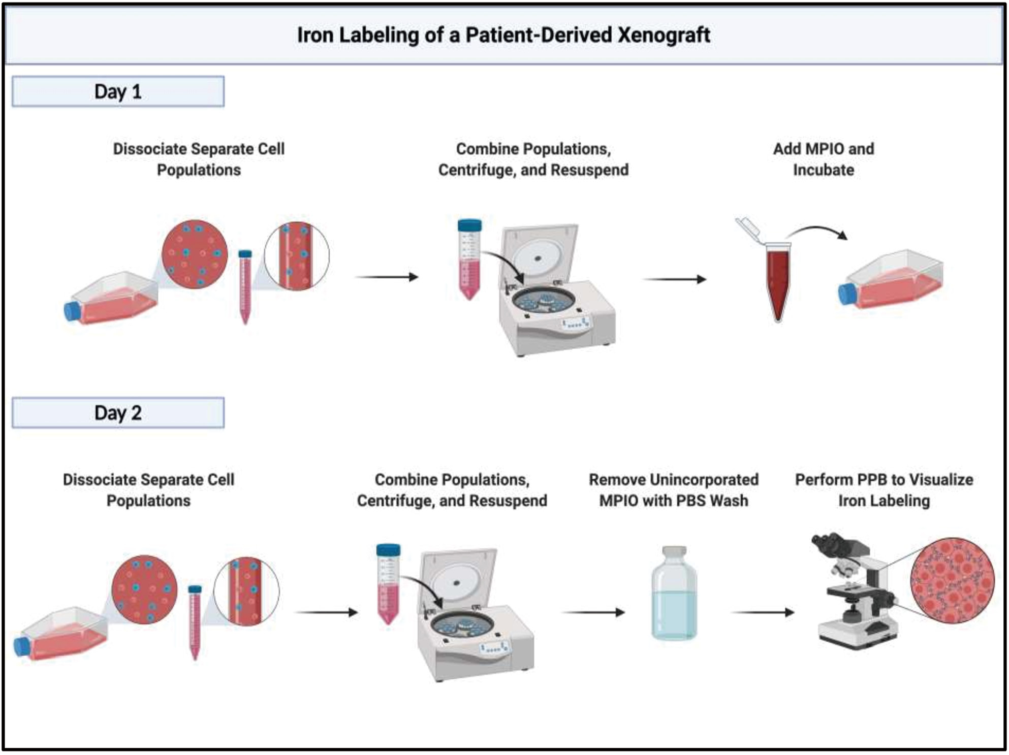 Figure 1. A simplified illustration of the workflow to efficiently label patient-derived xenograft cells with iron-oxide particles. Created with BioRender.com.