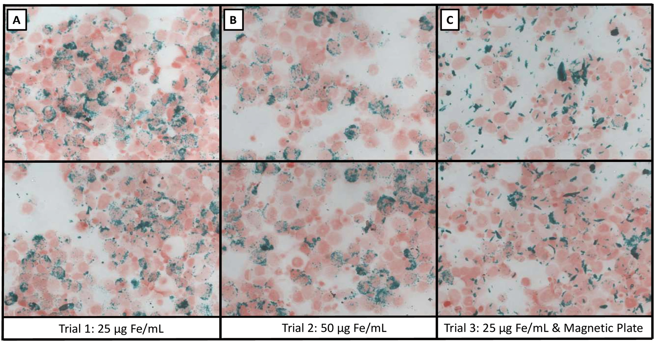 Figure 2. Perl’s Prussian Blue (PPB) stains of F2-7 cells labeled with MPIO. A. PPB stain showing F2-7 cells labeled with 25 μg Fe/ml of MPIO, with labeling efficiency of 81.80 ± 10.14%. B. PPB stain showing F2-7 cells labeled with 50 μg Fe/ml of MPIO, with a labeling efficiency of 27.51 ± 1.19%. C. PPB stain showing F2-7 cells labeled with 25 ug Fe/ml and a magnetic plate, resulting in a labeling efficiency of 5.5 5 ± 1.65%.
