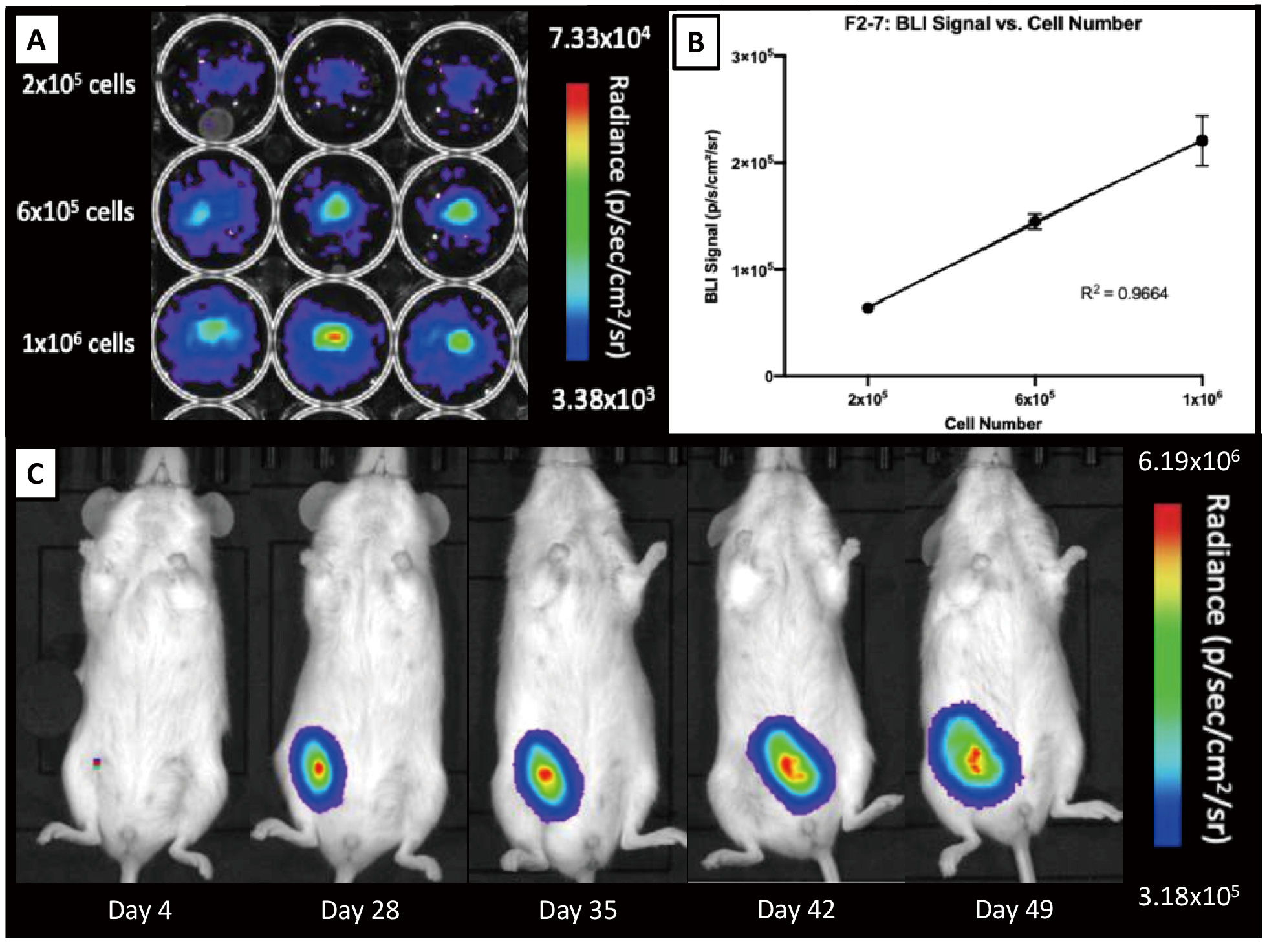 Figure 3. In vitro and in vivo bioluminescent imaging of F2-7luc/eGFP+ cells. A. F2-7luc/eGFP+ cells seeded at various concentrations. B. A strong linear correlation is seen between cell number and BLI signal; R2 = 0.9664. C. BLI signal from a representative tumor is shown to increase over time with tumor development from day 4 to day 49.