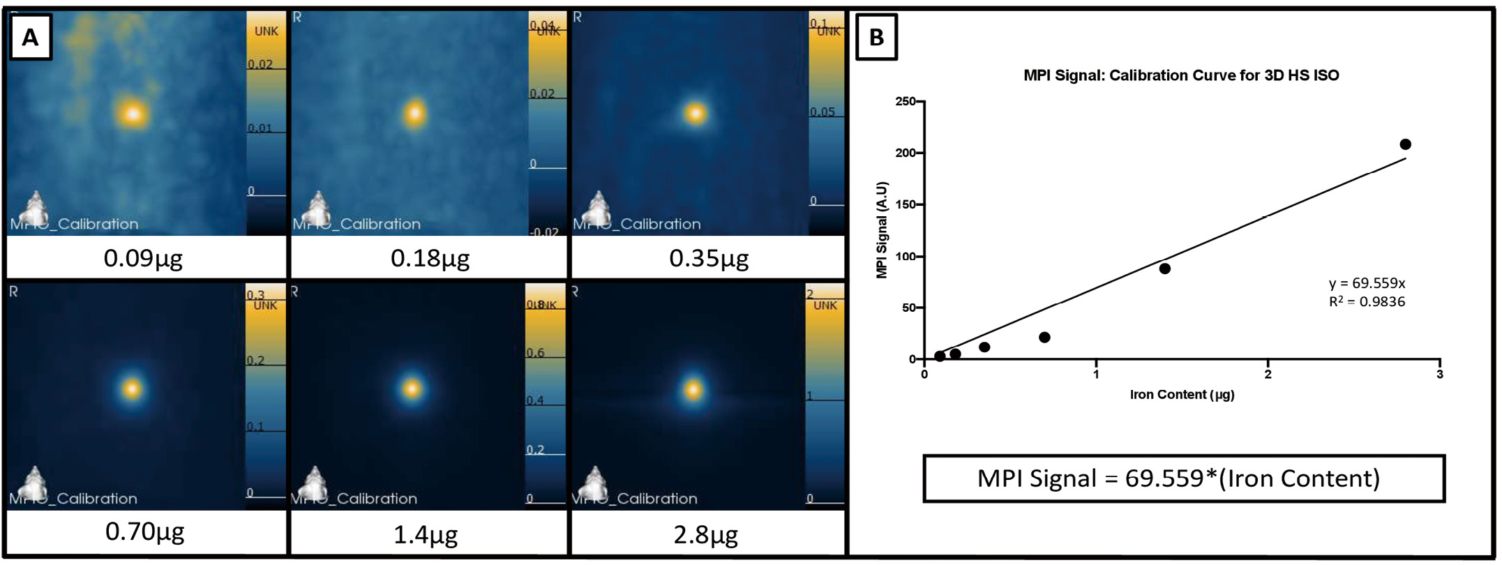 Figure 4. MPI calibration line generation and signal quantification. A. Images of MPIO samples measured to generate calibration curves. B. A strong linear relationship is seen between iron content and MPI signal. The asterisks in the equation represents a multiplication sign. R2 = 0.9836.