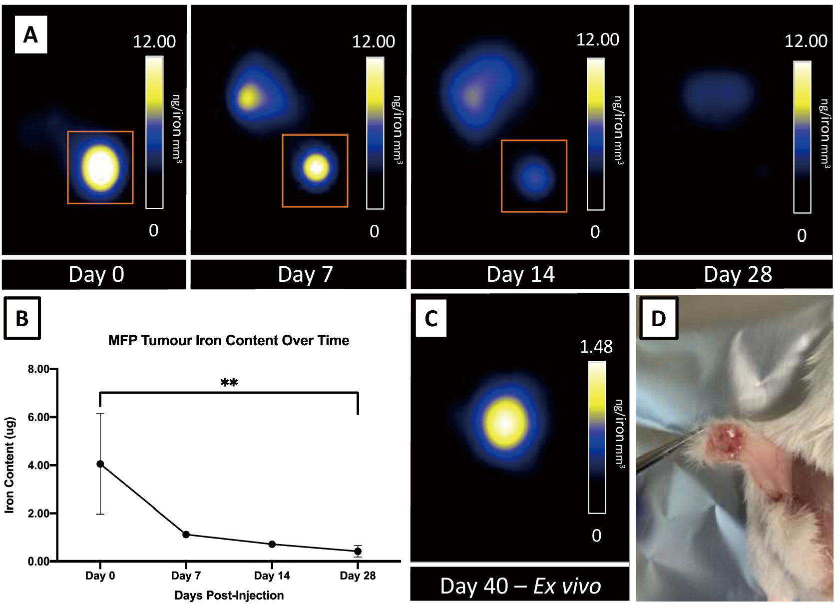 Figure 5. In vivo and ex vivo MPI of mammary fat pad tumors. Representative MPI of a tumor bearing mouse on day 0, 7, 14, and 28 post-injection of 1x106 MPIO-labeled F2-7 cells, with images window-leveled to the tumor (orange box). B. Quantification of mean iron content over time in MFP tumors decreasing significantly between day 0 (M = 4.06 ± 2.09 ug) and day 28 (M = 0.41 ± 0.25 ug) (P = 0.0095). The double asterisks represents statistical significance, indicating (P = 0.0095). C. Representative MPI of an ex vivo tumor removed on day 40. D. A representative ex vivo tumor of F2-7 cells.