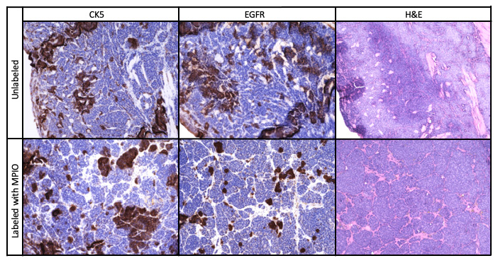 Figure 6. Expression of cytokeratin 5 (CK5) and estrogen growth factor receptor (EGFR) in MPIO-labeled and unlabeled F2-7 MFP tumors and corresponding hematoxylin and eosin (H&E) staining.