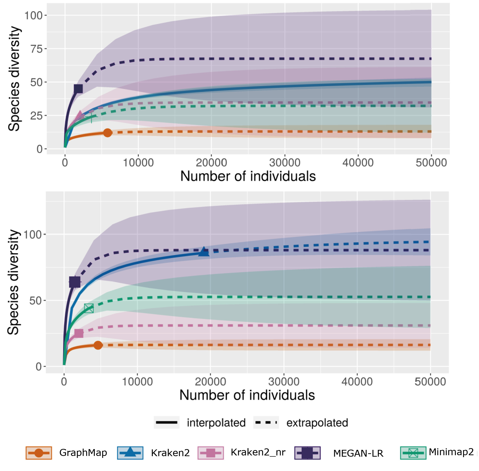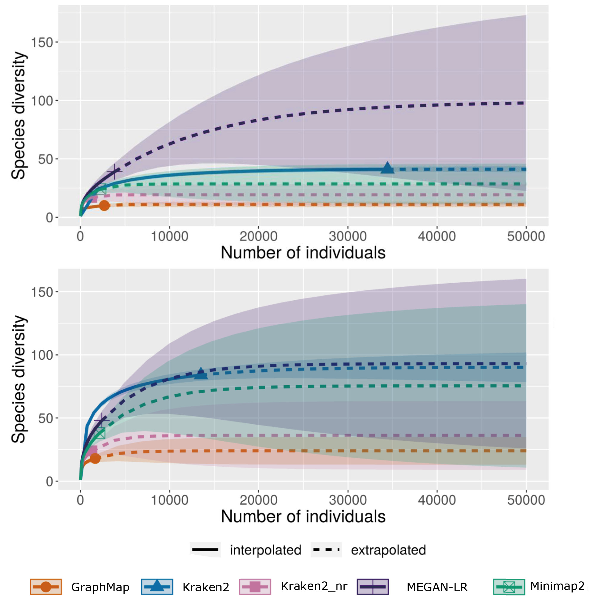 Under the “best-hit” criteria previously mentioned we used the NCBI taxonomy ID assigned by each method to each read, at the phylum and class taxonomic levels. iNext [26] was used to evaluate the thoroughness of taxonomic assignments by each method. We used Hill numbers to measure species diversity with 100 randomizations with replacement via iNext [26]. Species rarefaction curves using Hill numbers were calculated using iNext (26) to provide confidence intervals around extrapolation of the data to simulate taxonomic assignment with equivalent numbers of samples across the five methods.