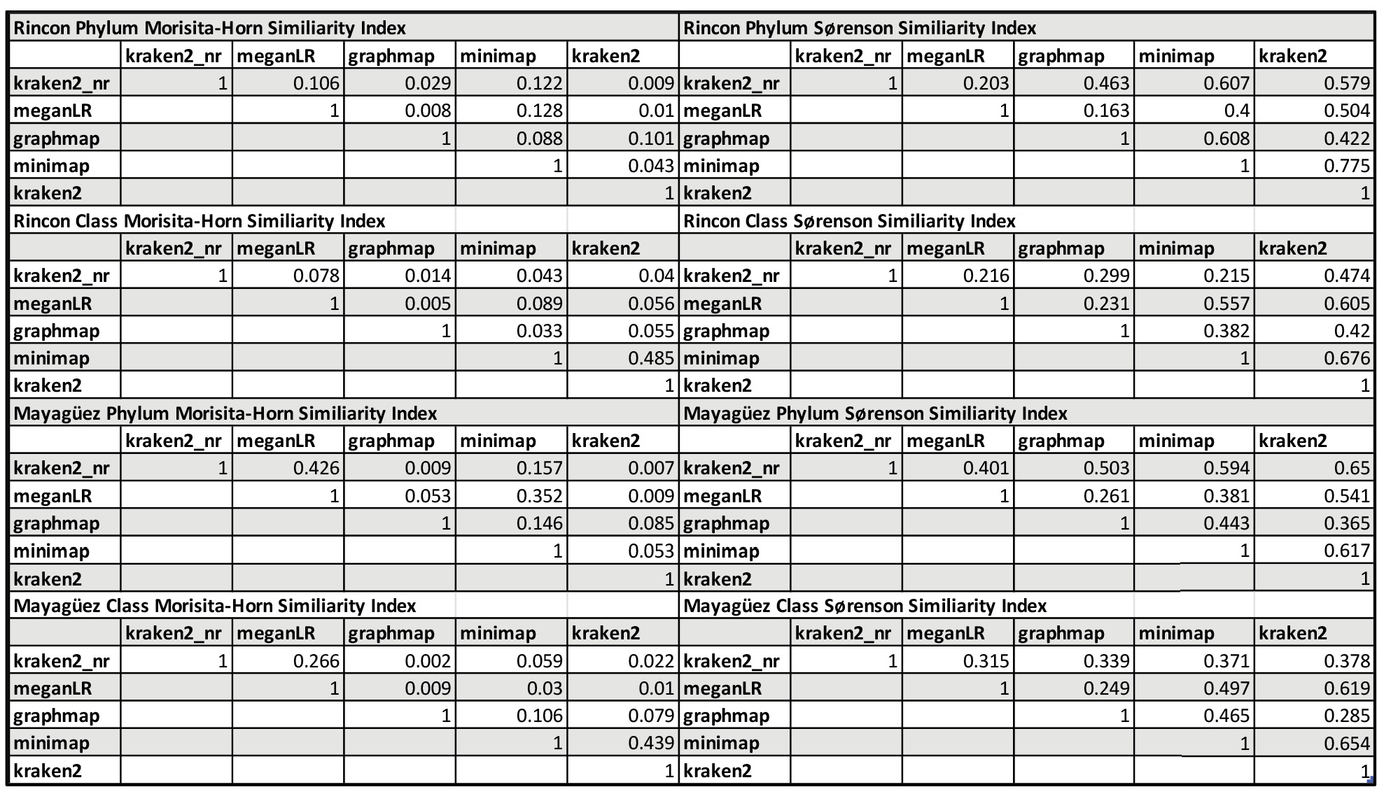 Via the Sørenson index, between all nucleotide methods there was at most a 78% and 62% overlap of phylum taxonomic assignment between Kraken2 and Minimap2 for the Rincón and Mayagüez samples via the Sørenson index (Table 1). Interestingly there was more similarity at the class taxonomic level via the Sørenson index between assignment methods Kraken2 and MEGAN-LR despite using different databases than between MEGAN-LR and Kraken2 protein mode that both use the NCBI nr database (Table 1).