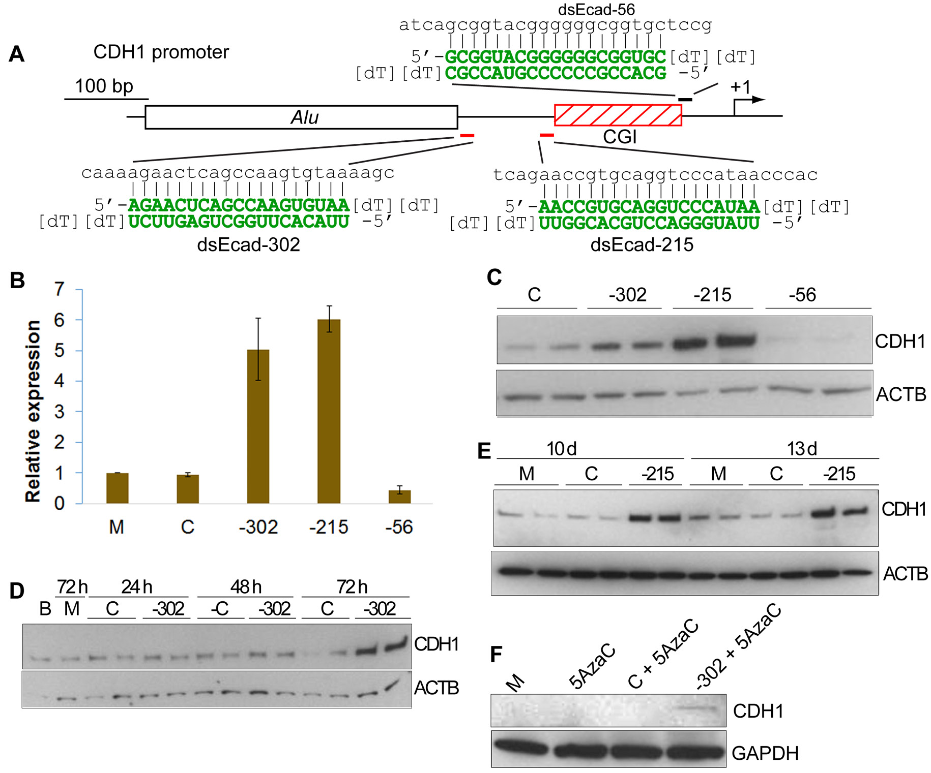 Figure 1. Activation of the CDH1 gene by RNAa and its related kinetics. A. Schematic representation of the CDH1 promoter. Indicated are its CpG island and Alu repetitive sequence. The CDH1 TSS (+1) is denoted by a bent arrow. Two saRNAs (marked in red) targeting sequences -302 (dsEcad-302) and -215 (dsEcad-215) relative to the TSS were generated according to design rules, whereas dsEcad-56 (marked in black) deviated from our design criteria. The sequence of each duplex is shown in green next to its derived target sequence in the CDH1 promoter. B. Induction of CDH1 expression by saRNAs. PC-3 cells were transfected at 50 nM of the indicated saRNAs for 72 h. mRNA expression of CDH1 in the transfected cells was assessed by quantitative RT-PCR. Results represent means ± SD of two independent transfections. C. Regional effect of RNAa on the CDH1 promoter. PC-3 cells were transfected as in (B). Protein levels of CDH1 and ACTB were analyzed by immunoblot analysis. ACTB served as a loading control. D. Delay in the onset of CDH1 induction by saRNA. PC-3 cells were transfected as in (B). Protein levels of CDH1 and ACTB were evaluated at 24, 48, and 72 h by immunoblot analysis. E. Prolonged activation of CDH1 by RNAa. PC-3 cells were transfected as in (B), split after ~4–5 days of culture and harvested on days 10 and 13 for analysis. CDH1 and ACTB levels were detected by immunoblot analysis. F. DNA demethylation restores RNAa. HeLa cells were treated at 1 µM 5-aza-2′-deoxycytidine (5-AzaC) with or without 50 nM of the indicated saRNAs for 72 h. Protein was isolated from the treated cells and subject to immunoblot analysis using a CDH1 or GAPDH specific antibody. Blank (B) denotes untreated cells. Mock (M) samples were transfected in the absence of saRNA. Control (C) treatments utilized a non-specific RNA duplex.