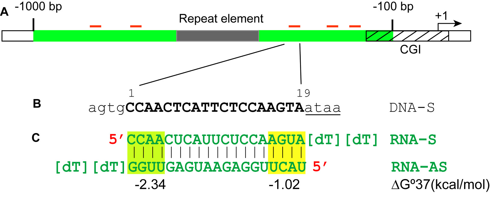 Figure 2. Guidelines for saRNA design on gene promoters. A. A hypothetical promoter with a CpG island (CGI, hatched box) and a repeat element (grey box) are shown. Five saRNAs (red bars) are designed within a region ranging from -100 to -1000 bp (green zone) relative to the TSS. The repeat element and CpG island were avoided as targetable sequence.