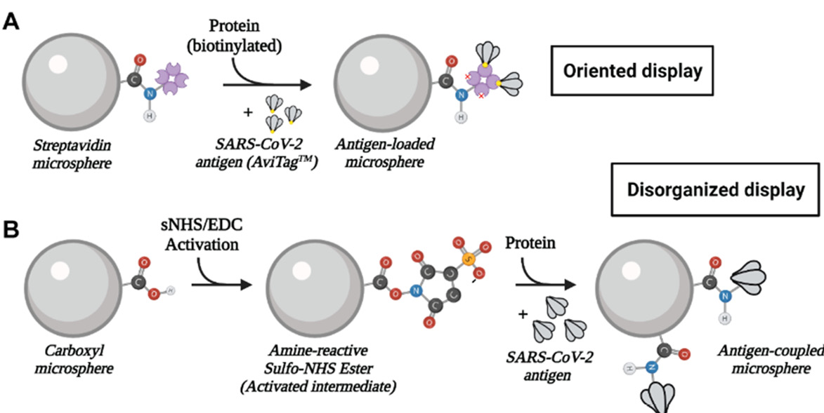 ™’, which allow anchoring to SA microspheres via the C-terminus of the protein. When bound to SA microspheres in this configuration, proteins can be displayed in a more uniform orientation that replicates those of the ectodomains of transmembrane proteins or viral spike proteins without destroying potential epitopes. In this study, we coupled a serologically relevant protein antigen, the receptor binding domain (RBD) of severe acute respiratory syndrome coronavirus 2 (SARS-CoV-2) spike protein, to COOH microspheres using conventional cross-linking chemistry and bound an AviTag version of the same antigen to SA microspheres to determine which approach is the most useful when developing microsphere-based serology assays.