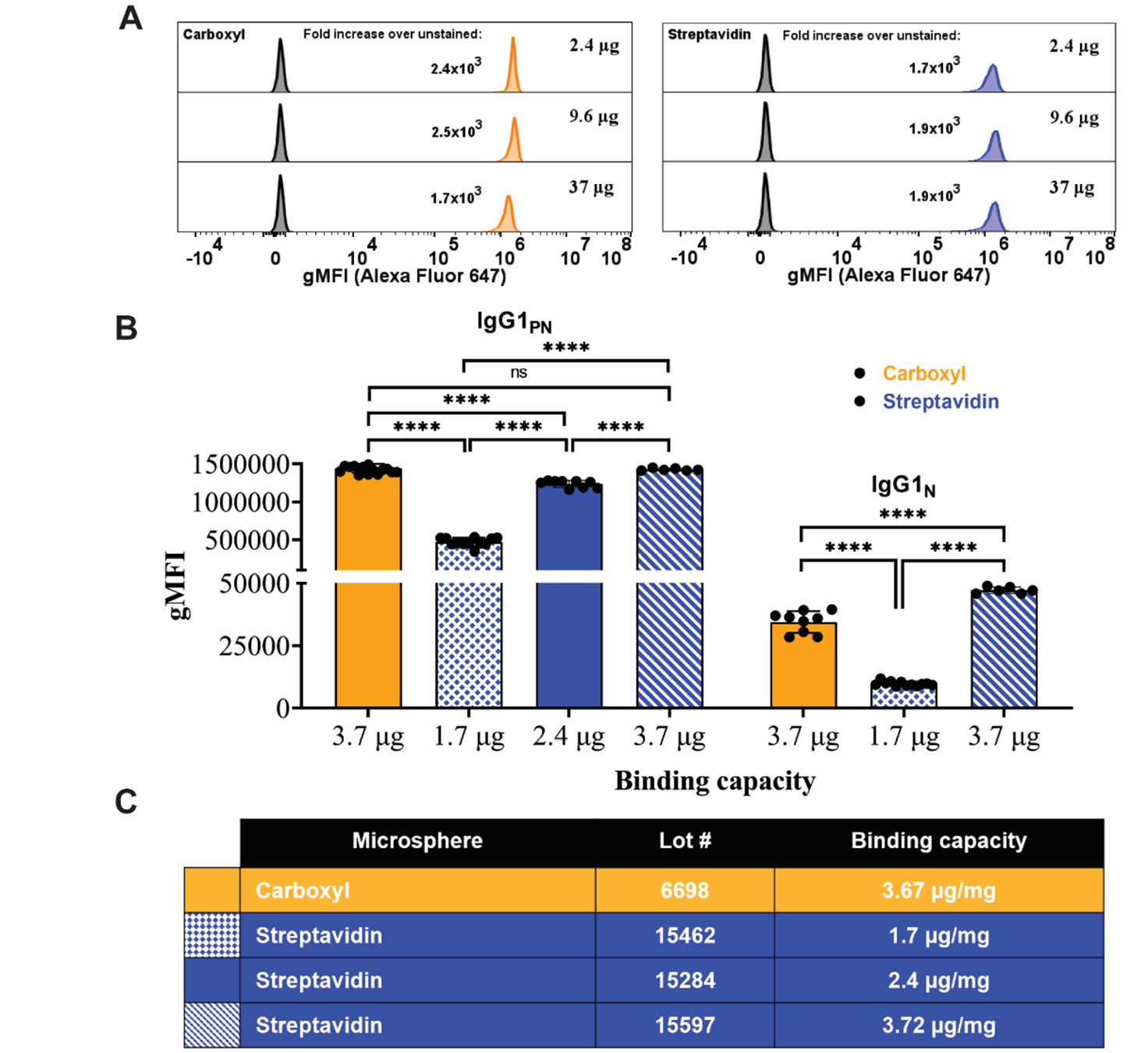 Figure 2 Antigen staining is robust for carboxyl and streptavidin microspheres. Carboxyl (COOH) and Streptavidin (SA) microspheres were bound to recombinant severe accurate respiratory syndrome coronavirus 2 (SARS-CoV-2) receptor binding domain (RBD) protein then stained with various primary and secondary monoclonal antibodies (mAbs) for flow cytometry. A. COOH (orange) and SA microspheres (blue) stained with RBD-specific IgG1. Shown are measurements of geometric mean fluorescence intensity (gMFI) as flow cytometric histograms, after loading microspheres with the indicated amounts of RBD (see methods for molar ratios and staining with IgG1PN mAb) Negative histogram peaks show background signal from unstained RBD microspheres. B. RBD bound COOH and SA microspheres were stained with RBD-specific IgG1 each recognizing different RBD epitopes. Shown are measurements of antibody binding (bar graphs) after staining with the indicated mAb clones. The bars represent the average of technical triplicates of N=3, error bars indicate S.D.P values represent a comparison between COOH and each lot of SA for each antibody clone using an ordinary one-way ANOVA. C. Table indicating the different lots and surface saturation values of the microspheres used in this experiment.
