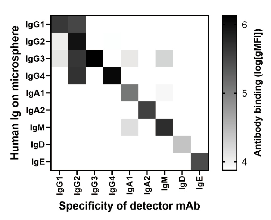 Figure 3 Detector antibody cross-reactivity is present and variable between detectors. Purified human Ig representing all isotypes coupled to carboxyl (COOH) microspheres were used to evaluate cross-reactivity of isotype-specific detector monoclonal antibodies (mAbs). Shown is a staining matrix in which each detector antibody was tested for binding to the indicated human immunoglobulin (Ig). Binding of detector mAbs is depicted on a log scale, where the darker shading indicates larger values (max, 2 x 106 gMFI). Background was set at 7500 gMFI, corresponding to the average intensity of unstained microspheres.