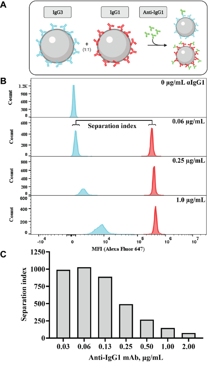 Figure 4 Detector mAb cross-reactivity between IgG subtypes is concentration-dependent. A. IgG1 and IgG3 coupled microspheres were mixed in a 1:1 ratio, then stained with anti-IgG1. Shown are B. Representative histograms of flow cytometric signal from IgG3 (blue) or IgG1 (red) microspheres after staining with the indicated amounts of anti-IgG1 detector mAb. C. Separation index values at specified concentrations. See Methods for the separation index formula.