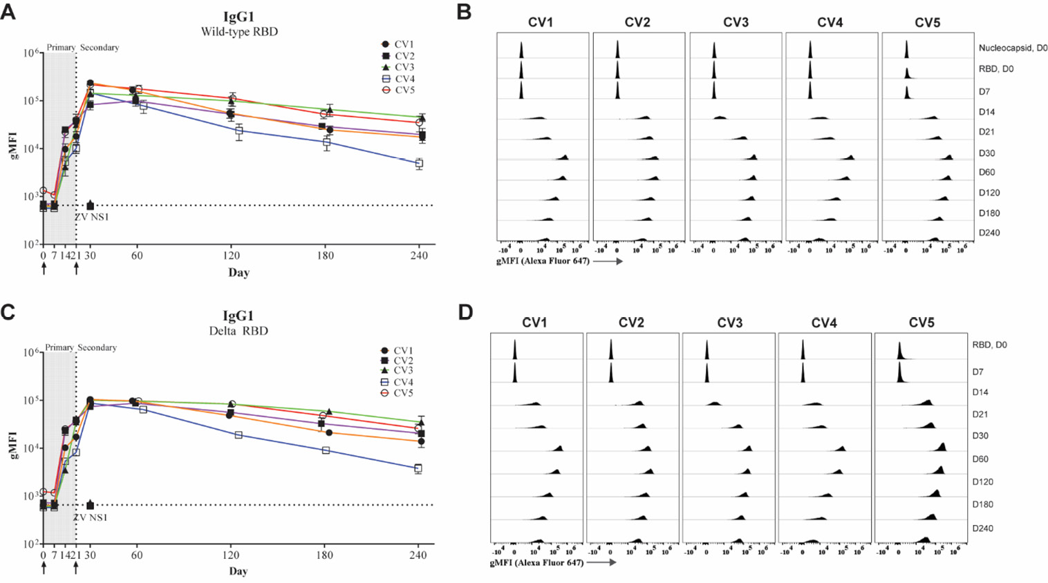 Tests of subsequent times points allowed us to assess durability of the IgG1-associated vaccine response (Fig. 5A, B). Of note, we found that the magnitudes of the peak antibody responses on Day 30 for each participant, were not consistently predictive of later titers. For example, sera from study participants CV3 and CV4 had similar peak titers on Day 30 which had diverged by the end of 240 days, while CV2 and CV1 showed somewhat different peak titers which had converged by Day 120 and remained indistinguishable through Day 240 (Fig. 5A). Additional tests with SA-microspheres loaded with mono-biotinylated RBD corresponding to that of the Delta variant were performed to investigate antibody binding differences between wild-type and variant antigen. As shown in Figure 5C and D, antibodies produced against wild-type (WT) and Delta variant RBD were broadly similar through Day 240 with significant differences at peak titer (Day 30) for three donors.