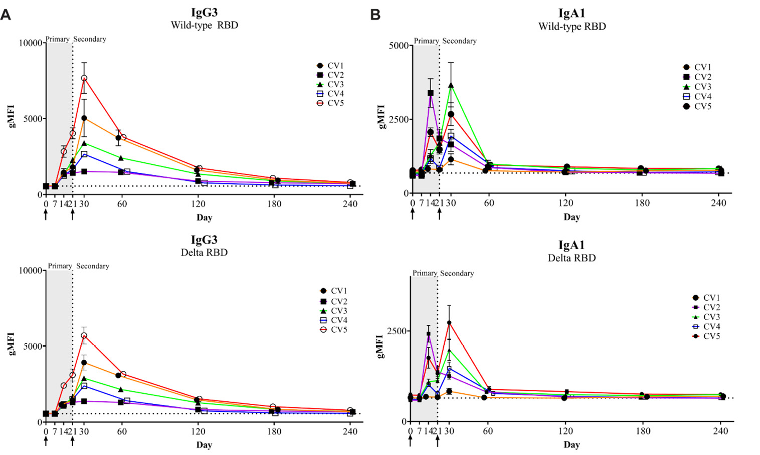 4]. Finally, IgA1 binding to WT and Delta variant RBD were broadly similar like IgG1 and IgG3 with donor variability in responses primarily at peak titer (Day 30) (