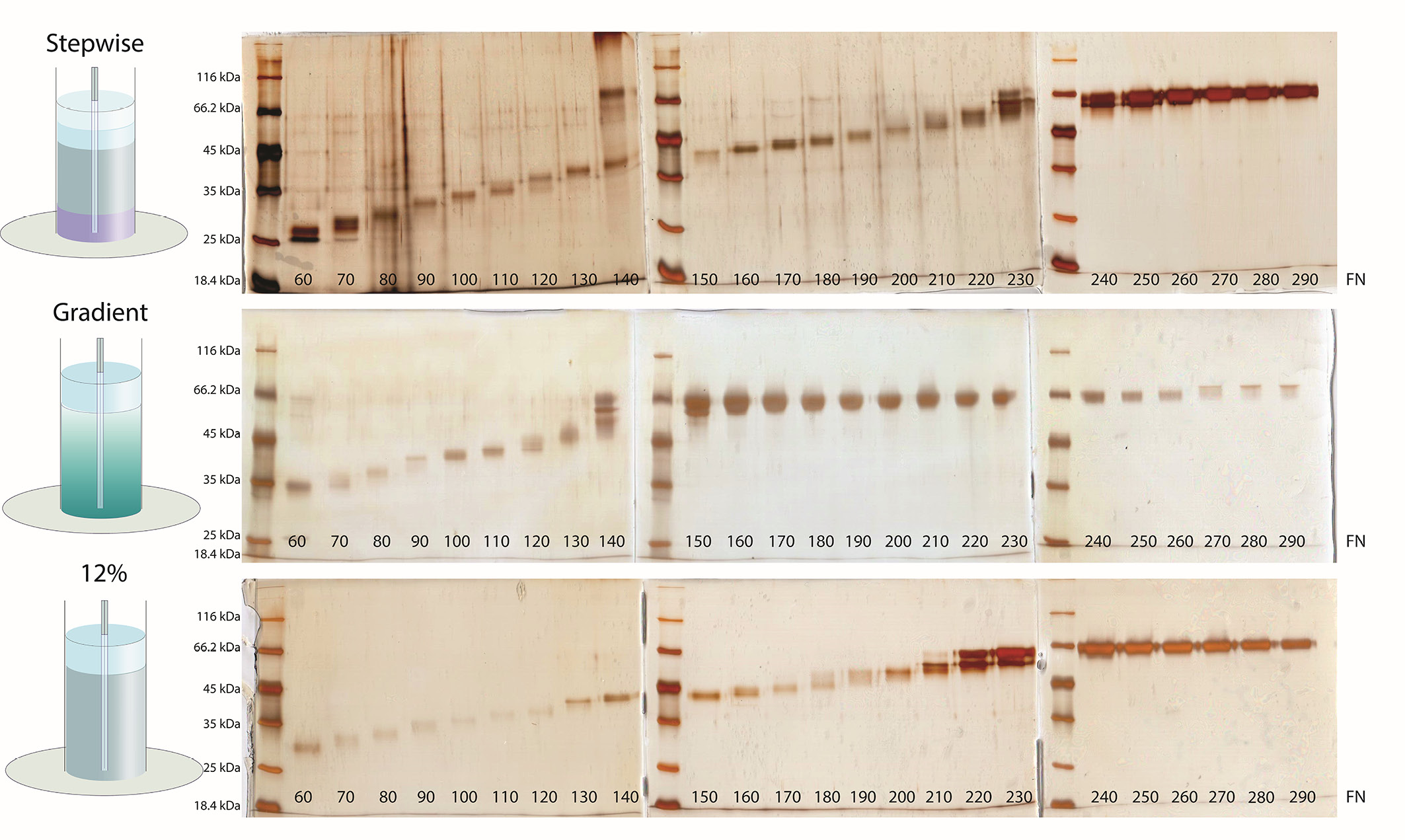Fig. 3). Although there are a few advantages of using gradient gels such as resolution of a broader range of proteins on a single gel, production of sharper bands and better separation of similar-sized proteins, gradient gels require more nuanced preparation than standard single concertation gels [