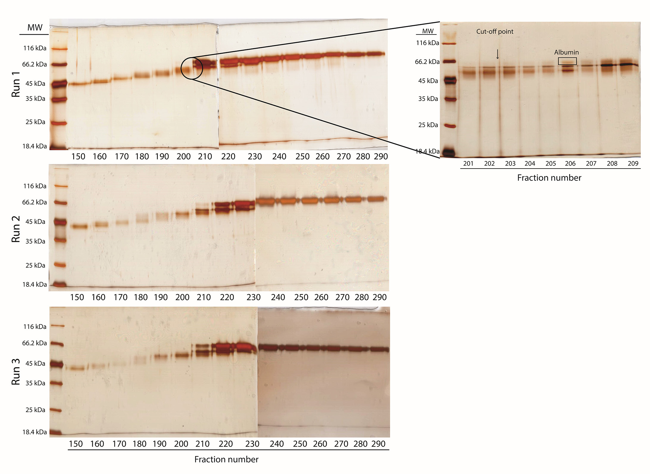 Figure 4 SDS-PAGE analysis of fractions from three independent preparative gel electrophoresis runs. Three hundred fractions were collected and every tenth fraction was subjected to SDS-PAGE analysis to roughly determine the albumin-containing fractions. Fraction 210 and above contained distinct bands of albumin. The exact location of the albumin-containing fractions was determined by SDS-PAGE analysis of each protein fraction between 201 and 209 (the outlet gel image). SDS-PAGE gels were silver stained and visualized with VersaDoc MP4000 imaging system.