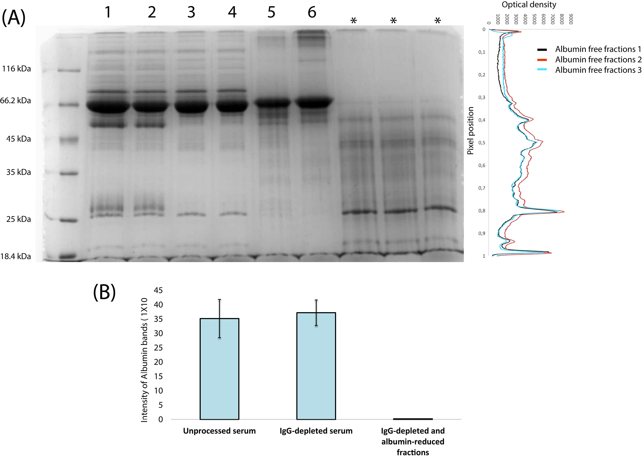 Figure 5 (A) SDS-PAGE analysis of the proteins from unprocessed serum samples (Lanes 1 and 2), IgG-depleted flow-through fractions from the protein G column (Lanes 3 and 4) and albumin-containing fractions eluted from preparative gel fractions (Lanes 5 and 6). The last three lanes marked with asterisks were run to demonstrate the absence of IgG and albumin bands in IgG-depleted and albumin-reduced serum samples. (B) Graphic representation of the albumin reduction. The graph was generated by measuring the intensities of albumin bands on the gels using Quantity One software.