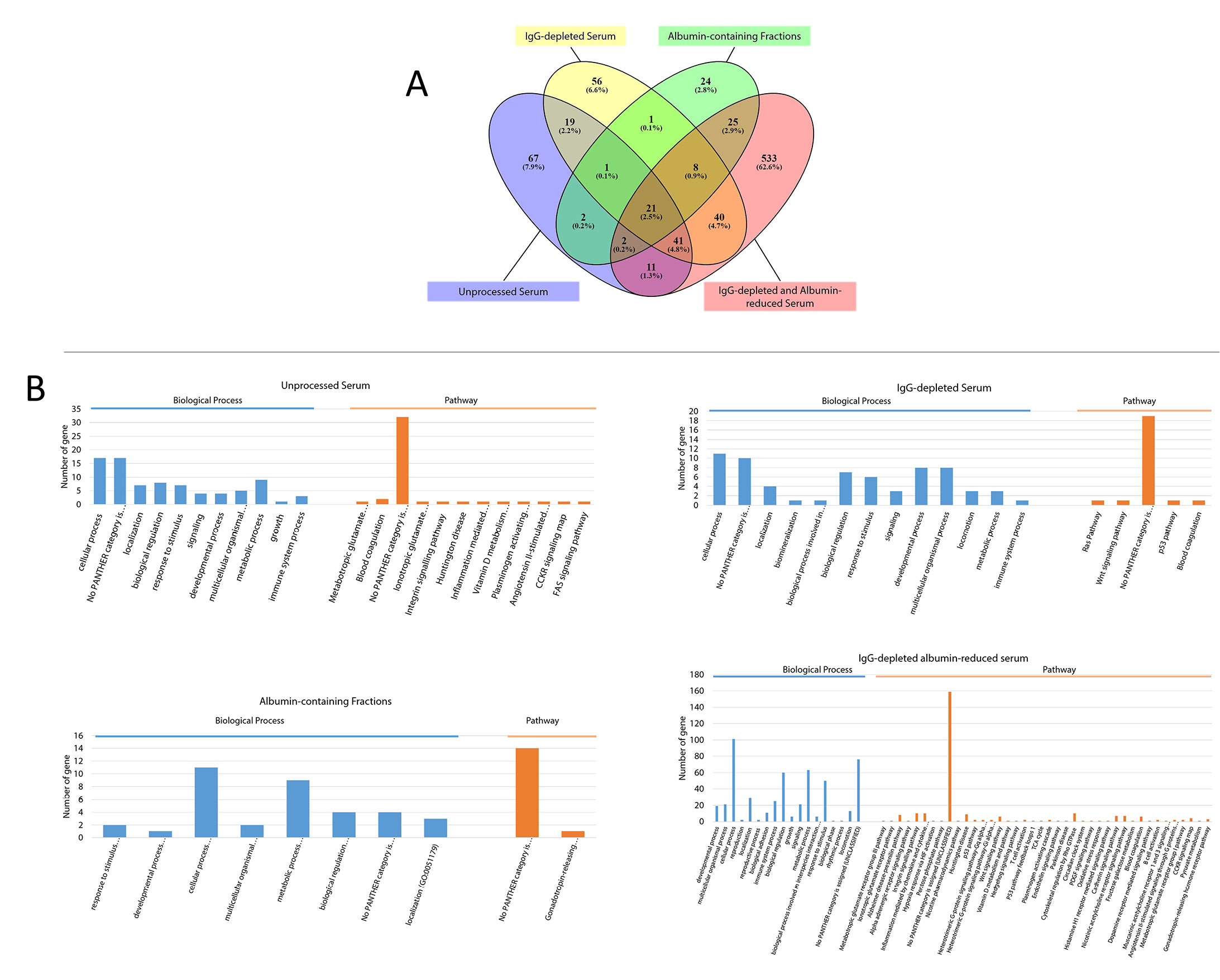 Bioinformatic analyses was performed to assess the characteristics of low abundance proteins identified throughout the enrichment process. Differences after each enrichment step were elucidated by comparisons. Unique low abundance proteins were identified in each enrichment step (Fig. 7A). When these low abundance proteins were subjected to PANTHER analysis, the proteins from IgG-depleted and albumin-reduced serum samples displayed the most versatile biological process and pathway involvement followed by the low abundant proteins from unprocessed serum, IgG-depleted serum and albumin-containing serum samples (Fig. 7B). A similar analysis was also performed with STRING. Low-abundance proteins from unprocessed serum samples were associated with immune response, complement activation and transport, while the proteins unique to IgG-depleted serum samples were involved in RNA splicing and binding. Interestingly, proteins associated with DNA replication, haemoglobin binding and displaying oxygen carrier activity were found in the albumin-containing fractions. In the IgG-depleted and albumin-reduced serum samples, due to the large number of low-abundance proteins, a complex protein interaction network connecting various metabolic events and biological processes was detected (Fig. S1).