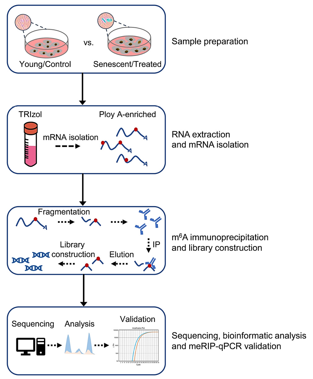 In this study, we worked out a workflow for using meRIP-seq to study RNA m6A modifications in control (non-senescent) and senescent human cells, which included operational steps for sample preparation, mRNA isolation, immunoprecipitation, library preparation, sequencing, bioinformatic analysis and target gene validation via reverse-transcription quantitative PCR (RT-qPCR). We also provided tips and considerations in the optimization of the protocol and interpretation of the results. Overall, this workflow provided a detailed procedure for investigating transcriptomic m6A alterations and identifying downstream targets of interest in cellular senescence.