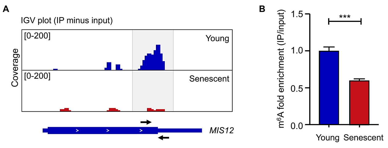 Figure 2. m6A modification on MIS12 mRNA in young and senescent cells. A. IGV views showed the m6A signals on MIS12 transcript in young and senescent cells. Peaks are represented as subtracted read densities (IP minus input). Black arrows indicate the forward and reverse primers. B. MeRIP-RT-qPCR was conducted to examine the m6A enrichment on MIS12 mRNA in young and senescent cells. Statistical analysis was performed by using GraphPad Prism (Student’s t-test).
