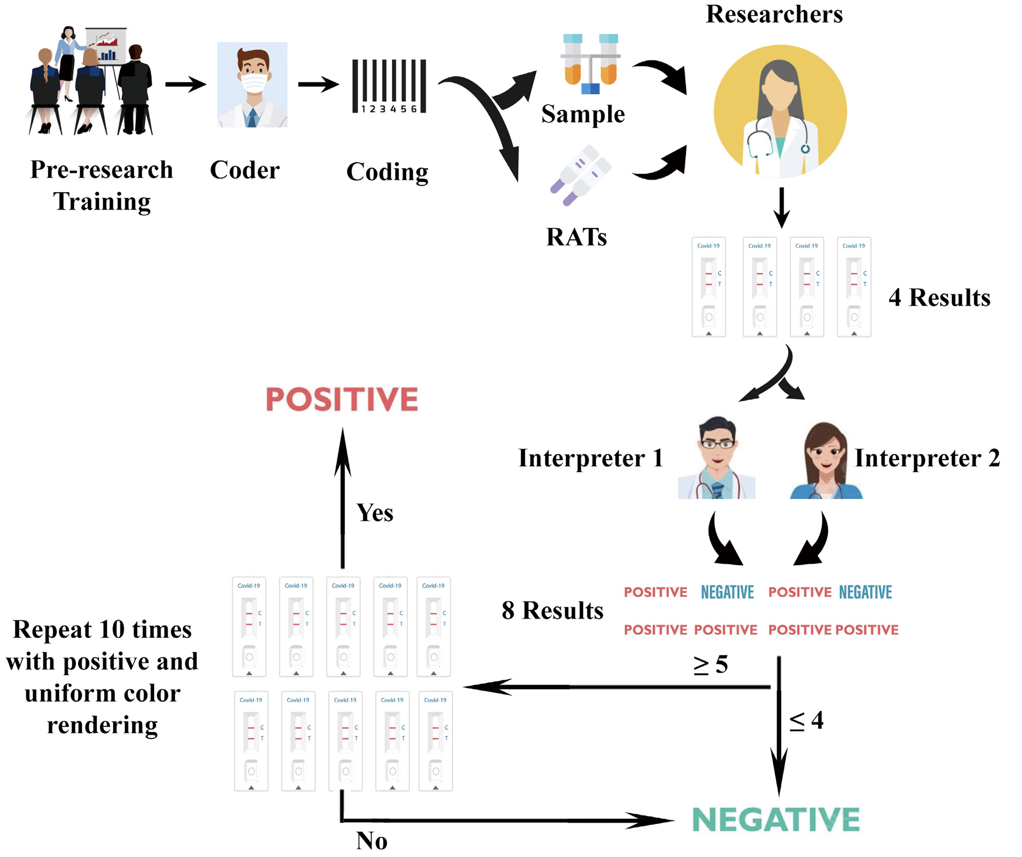 Figure 1. Flow of the evaluation protocol for RAT qualitative test performance. The study was conducted by using a blind method. With researchers and interpreters blinded, we finally obtained eight results interpreted as positive more than or equal to 5 times, while ten repetitions were positive and showed uniform color, which we rated as positive. All other cases were deemed negative.
