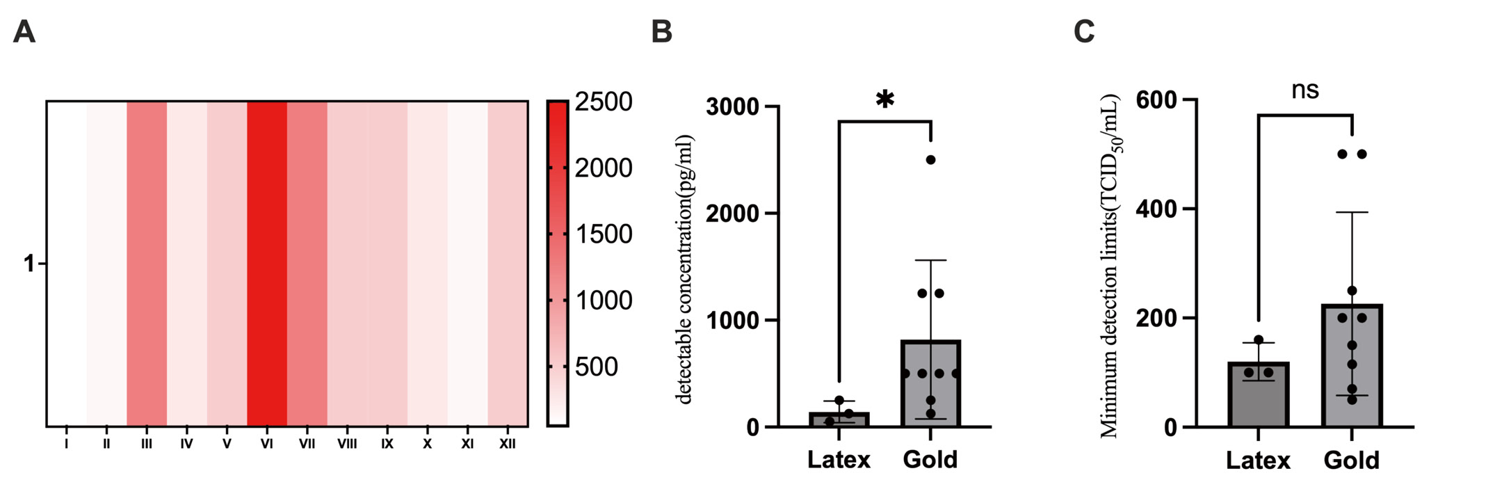 Figure 3. The minimum concentration of standard substances in different Rapid Antigen Test kits. A. Heatmap of the minimum concentration of standard substances in different Rapid Antigen Test/RAT kits; B. Minimum detection limits for colloidal gold and latex in RATs; C. Minimum TCID50 for colloidal gold and latex according to manuals provided by the manufacturers. Data were presented as means ± S.D., *P < 0.05.