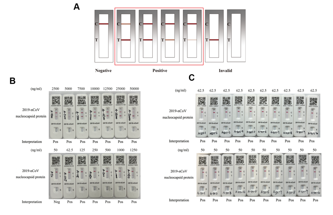 Figure 2. Concentration gradient and Repeatability test for 2019-nCoV nucleocapsid protein. A. Result interpretation of COVID-19 Ag-RATs; B. The addition of sample dilutions of different concentrations to the RAT test plate allowed for the observation of lines with varying display levels. With this RAT, at 50,000 pg/ml and 25,000 pg/ml, the T line was more conspicuous than the C line, and gradually became lighter. It was judged to be weakly positive until 50 pg/ml, when the T-line was the faintest; C. Ten replicates were performed for RAT plates showing weak (50 ng/ml) and moderate (62.5 ng/ml) positivity in this RAT. Each replicate was positive at each concentration and showed consistent color shade.
