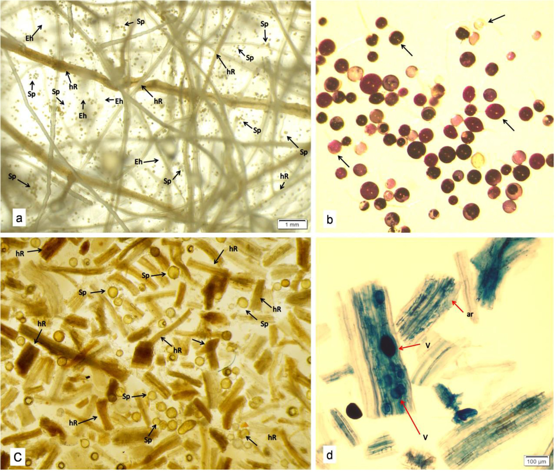 Figure 2 Final stages of in vitro AMF culturing in the current investigation. (a) Extraradical AMF spores observed in the ROC after 85 days of incubation showing healthy culture growth (Sp-Spores, hR-Host Roots, Eh-Extraradical hyphae) (b) Assessment of spore viability in end-product (c) The end-product, obtained through harvesting and subsequent drying, displayed AMF propagules, which included spores and roots fragments. (d) Presence of intraradical colonization of AMF inside the root fragments of the end-product verified their viability as propagules (V-Vesicles, ar-Arbuscules).