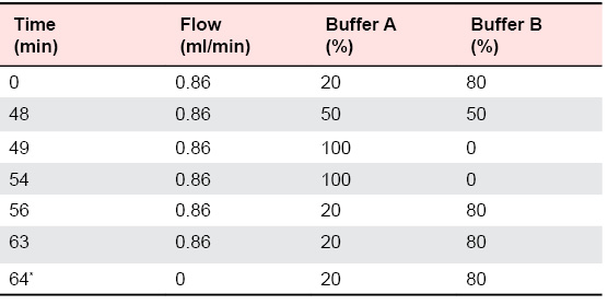 Table 1. Flow rate and gradient for 1525 µ binary pump. * Run time is for final sample only to stop the pumps. Actual run time for each sample is 63 min.