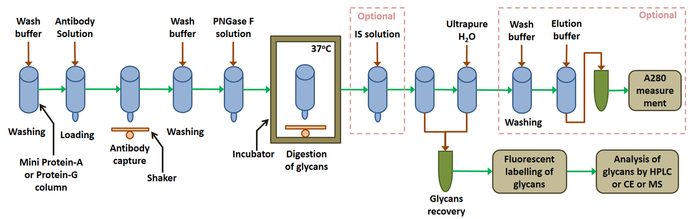 Figure 1. Schematic representation of the steps involved in the process of isolation and characterization of N-glycans from antibodies. The steps in the dashed-line boxes are optional and only needed to quantity the molar yield of glycans from antibodies. IS: internal standard; HPLC, high performance liquid chromatography; CE, capillary electrophoresis; MS, mass spectrometry, A280, absorbance at 280 nm.