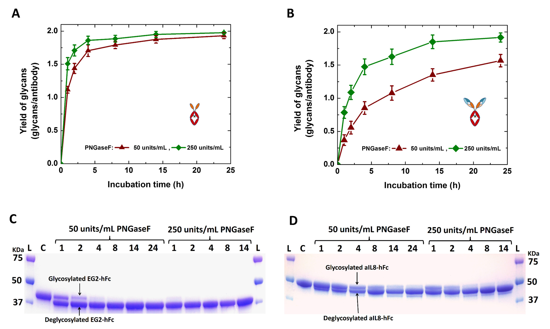 Figure 2. Kinetics of PNGase F digestion of N-glycans from monoclonal antibodies immobilized onto protein-A. A and B. Quantities of glycans released by the PNGase F digestion of immobilized EG2-hFc (A) and aIL8-hFc monoclonal antibodies (B), as a function of digestion time with two different PNGase F concentrations. C and D. SDS-PAGE analysis under reducing condition of corresponding EG2-hFc (C) and aIL8-hFc (D) samples eluted from Protein-A column after digestion with PNGase F for indicated hours (top line). L, Protein ladder, C, Control sample (t = 0).