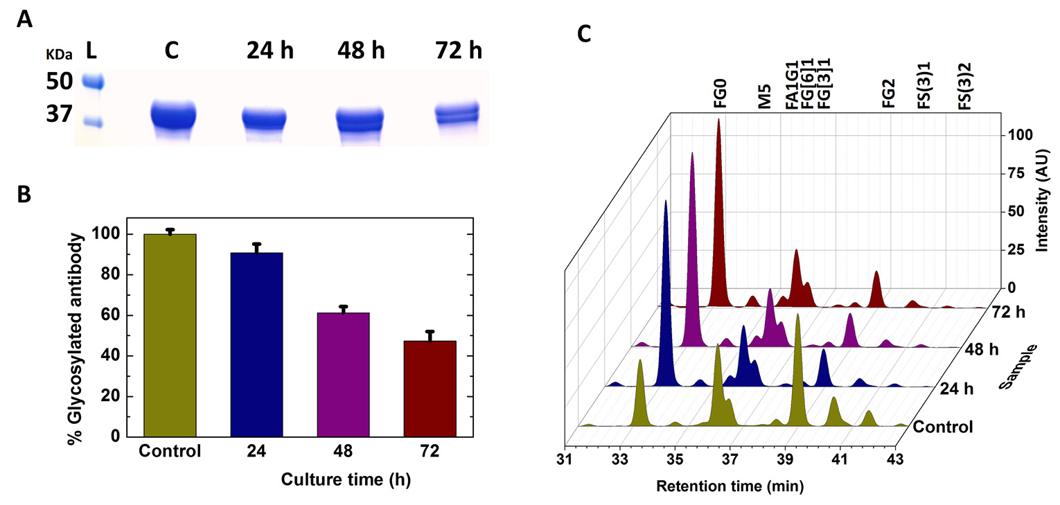 Figure 4. Application of the current glycan analysis method to detect and quantify macro-heterogeneity of N-glycosylation in monoclonal antibodies. A. SDS-PAGE analysis of the purified mAb samples harvested at 24, 48 and 72 h of culture after transferring into 5 mM glucose medium. B. Quantification of macro-heterogeneity in the corresponding samples using the current method. C. N-glycan distribution profiles of the corresponding samples. The data represents the average of two culture samples. L: Protein ladder, C: Control sample.