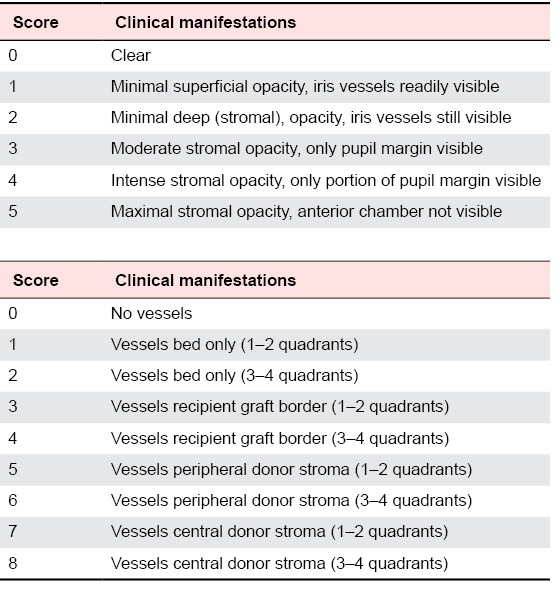Examine all grafted eyes using a slit lamp microscopy, and exclude grafts with technical difficulties (hyphema, infection, loss of anterior chamber). Examine grafts weekly by slit-lamp microscopy for edema, opacity, and neovascularization. Use a standard scoring system [13] (see Table 1) to describe the extent of opacity and neovascularization. Grafts with an opacity score of 2+ or greater 3 weeks after transplantation are considered rejected (immunologic failure). Grafts with an opacity score of 3+ or greater at 2 weeks post-transplantation that never clear are also considered rejected.