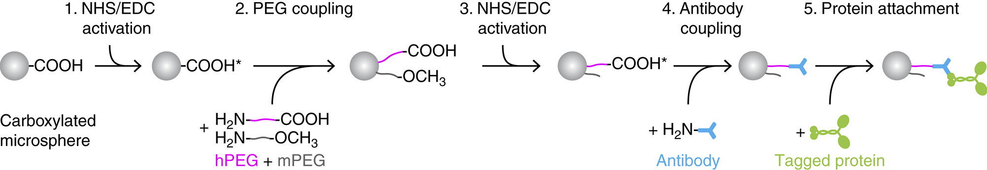 Fig. 1). The coupling uses the well-established NHS/EDC activation. In addition, to prevent microsphere aggregation, we simultaneously cover the microspheres with a dense monolayer of covalently-attached PEG molecules, which do not have any further reactive groups at the free end. PEGylation is widely used to efficiently passivate microspheres for