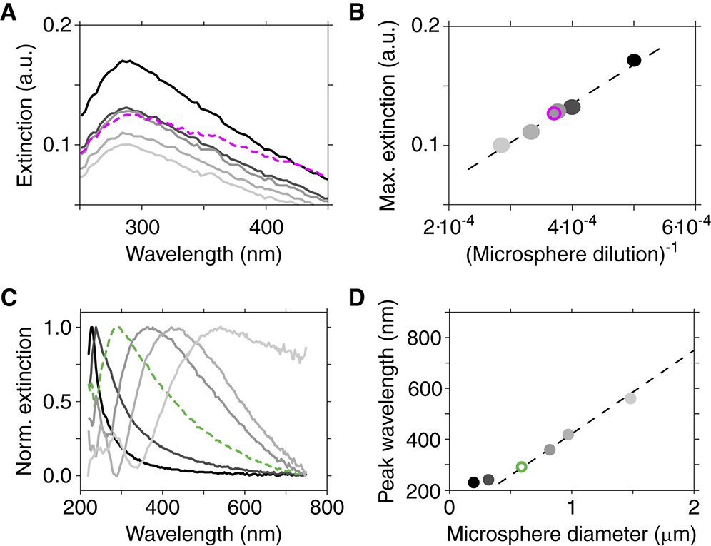 Figure 4. Measurement of microsphere concentration. A. Extinction spectra for different stock microsphere (590 nm PS-COOH) dilutions (2000, 2500, 2700, 3000, 3500: lines from black to light gray) and one batch of diluted anti-GFP-PEG-coated PS microspheres (magenta dashed line, 1000). B. Maximum extinction for 590 nm-diameter microspheres at 290 nm as function of (microsphere dilutions)-1 (colors correspond to (A) with a linear fit (black dashed line). The peak height was inversely proportional to the microsphere dilution. C. Normalized extinction spectra for different microsphere diameters (200 nm, 320 nm, 820 nm, 970 nm, 1480 nm: lines from black to light gray; 590 nm: green dashed line). D. Peak wavelength of the extinction spectra as function of the microsphere diameter with a linear fit (dashed line) for diameters ≥ 590 nm. Symbol colors are given in (C).