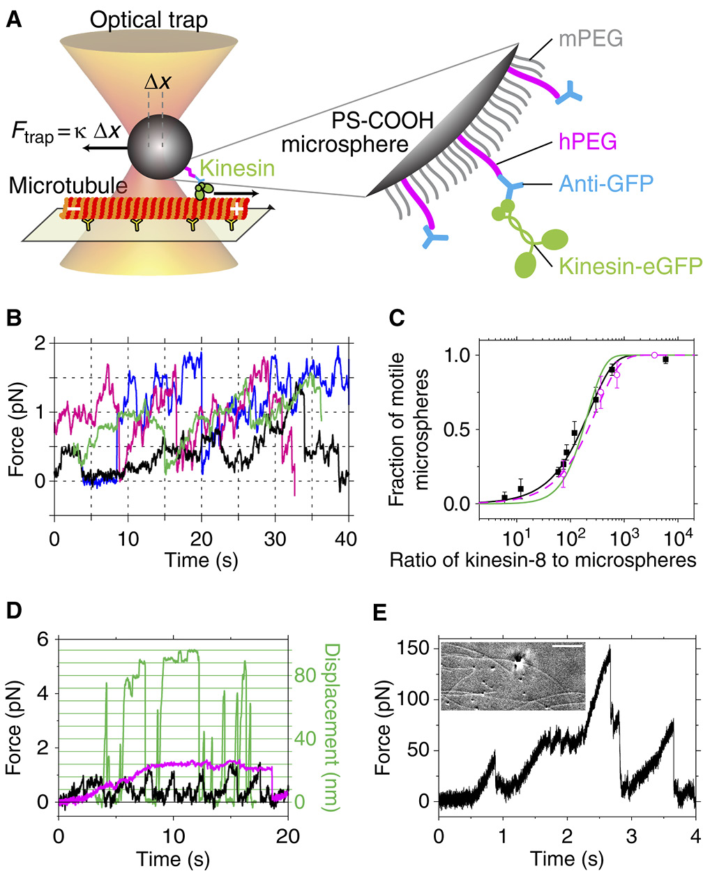 Figure 3. Motility measurements with preserved functionality. A. Schematic of an optical tweezers single-molecule experiment with kinesins.
